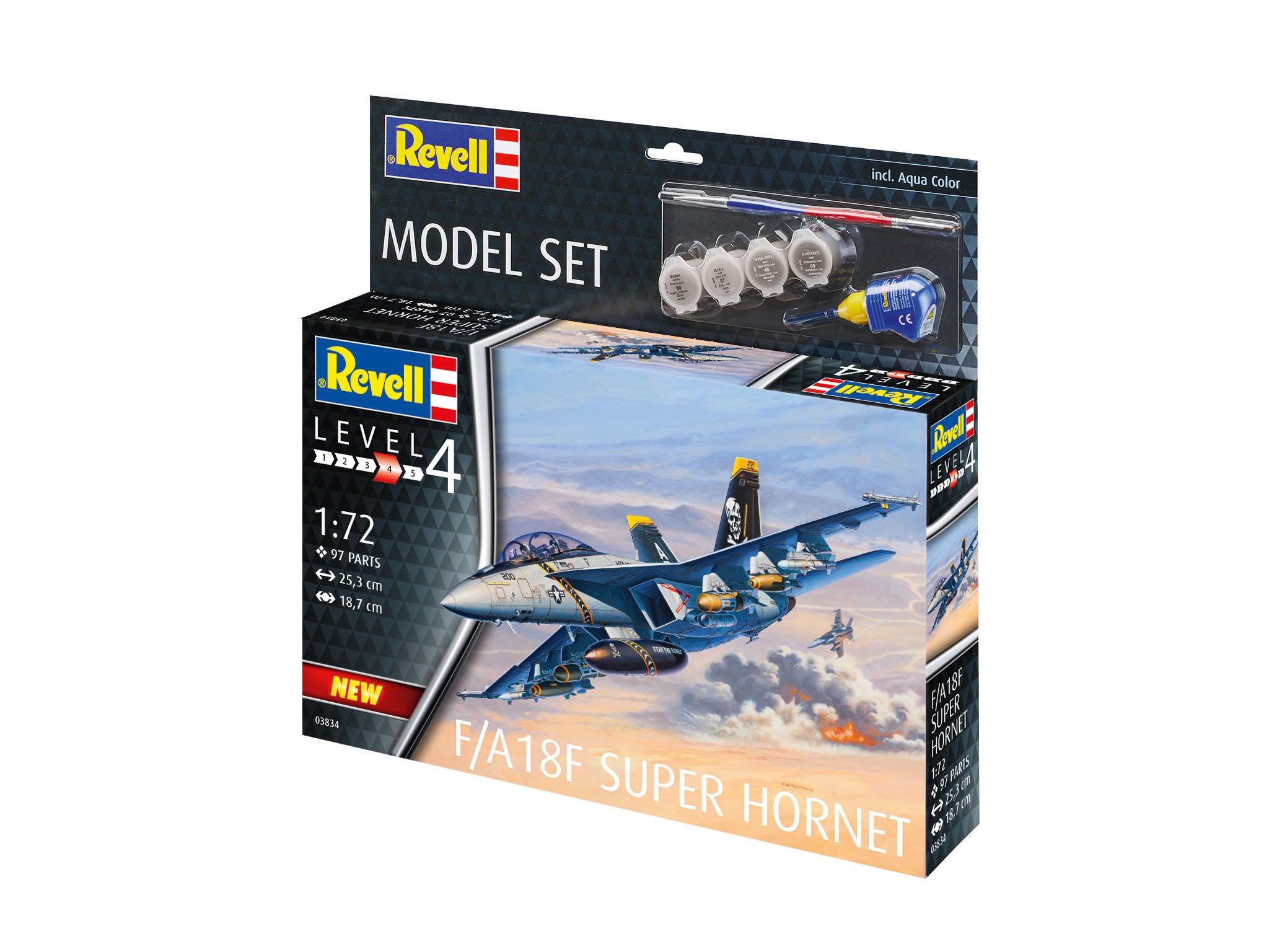 Set de modelare cu accesorii (4 vopsele de baza, pensula, lipici). F/A-18F Super Hornet - un avion supersonic american multirol al Marinei SUA. Culori de vopsea recomandate: 32115, 32136, 32148, 32165, 32167, 32168, 32176, 32183, 32199. Kit model plastic Revell (REV-63834). Specificatii Numar de catalog: REV-63834 Producator: Revell Lungime: 253 mm Anvergura aripilor: 187 mm Inaltime: 67 mm Scara: 1:72 Nivel de dificultate: 4 Numar elemente: 87 Instructiuni: da Grupa de varsta: 12+