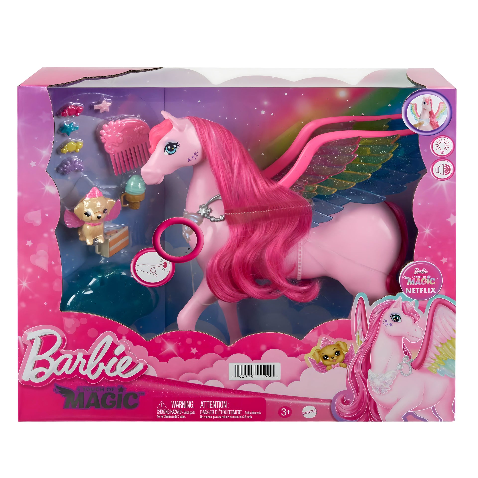 Inspirat de aventurile de la Barbie A Touch of Magic™, acest Pegasus magic vine cu zece accesorii diferite, precum si functii de lumina si sunet!