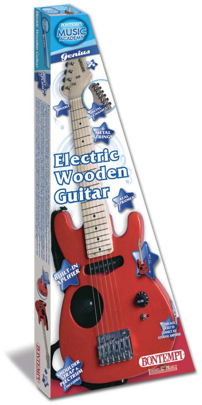 Chitara electrica din lemn Bontempi, cu finisaj extrem de lacuit.6 corzi metalice acordabile.mecanica cromata si chei de nichel / argint.pickup de calitate pentru sunete tipice de chitara electrica.amplificator integrat si difuzor.reglati volumul.Mufa de 6,3 mm pentru conectarea unui amplificator extern.curea de umar reglabila din tesatura robusta.alimentare cu 6F22 9V baterie (neinclusa).lungime 77 cm.Beneficii familiarizarea cu muzica si ritmul, dezvoltarea abilitatilor sociale si cognitive, coordonarea miscarilor, atentia distributiva.