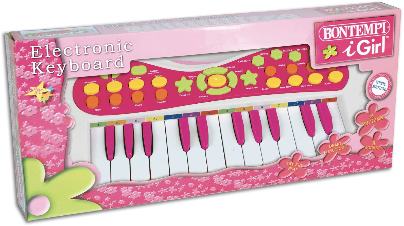 Orga electronica cu efecte luminoase cu 24 de clape. 4 pad-uri pentru a canta la tobe sau a asculta vocile animalelor. 8 sunete si 8 ritmuri. 8 melodii preinregistrate. Va puteti inregistra si asculta melodiile. Alimentare 3 x 1,5V R6 / baterii AA (nu sunt incluse). Dimensiuni 400x70x230 mm. Beneficii familiarizarea cu muzica si ritmul, dezvoltarea abilitatilor sociale si cognitive, coordonarea miscarilor, atentia distributiva.