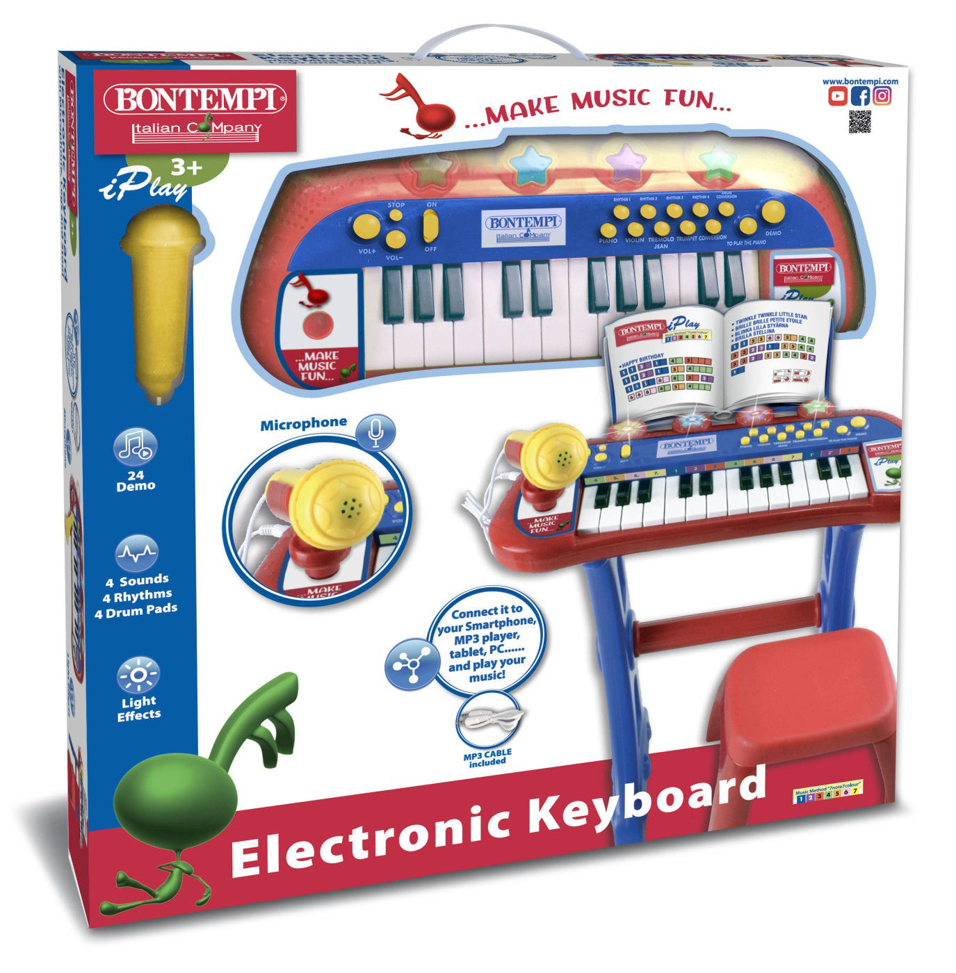Bontempi Orga electronica pentru copii cu scaun si microfonOrga electronica pentru copii cu microfon si scaun va va ajuta sa descoperiti sunete, stiluri muzicale si cantece.Tastatura electronica cu 24 de taste cu microfon.4 sunete.4 ritmuri cu aranjament.4 sunete de tobe.4 ritmuri cu sunete de tobe.Spectacol de lumini magice.24 de cantece demonstrativeOKON (functie de invatare).Controlul volumului.Priza pentru sursa audio externa (MP3 player, smartphone, etc.) - cablu inclus.Mufa pentru microfon condensator (inclusa).Alimentare 3 baterii R6 / AA 1.5V (nu sunt incluse).Dimensiuni 400x400x570 mm.