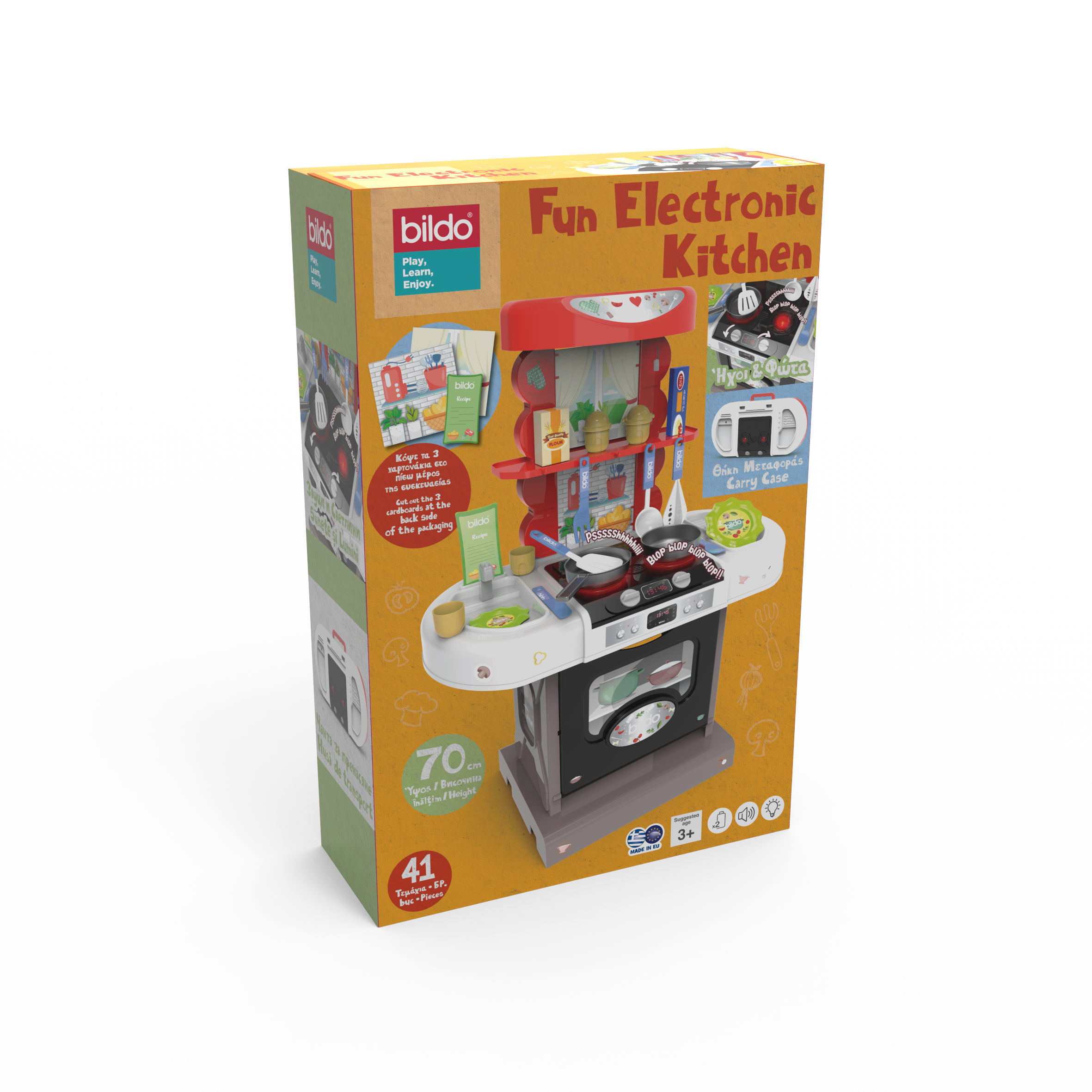Setul include 41 de piese – ustensile, vase, accesorii și alimente de jucărie – oferind tot ce au nevoie pentru ore întregi de joacă creativă. Funcțiile speciale cu sunete și lumini fac experiența și mai captivantă, imitând perfect gătitul adevărat.
