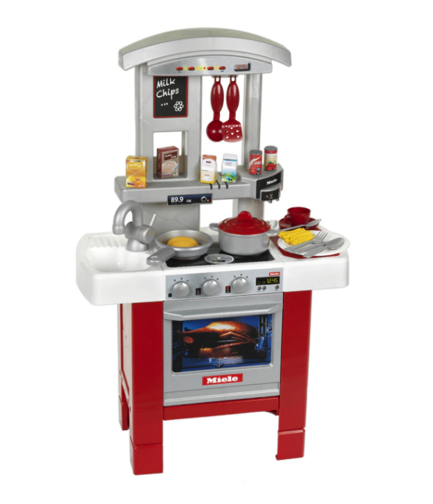 O bucatarie cu aragaz si cuptor cu usa ce se deschide si sunete de gatit. Include accesorii precum: tacamuri, oala, tigaie, polonic, condimente pentru gatit.