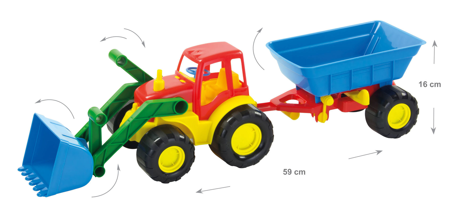 Buldozerul este echipat cu o cupa si remorca ideal pentru a transporta diferite jucarii. Copilul are posibilitatea de a juca o varietate de jocuri de constructie, atat in curte cat si in casa.