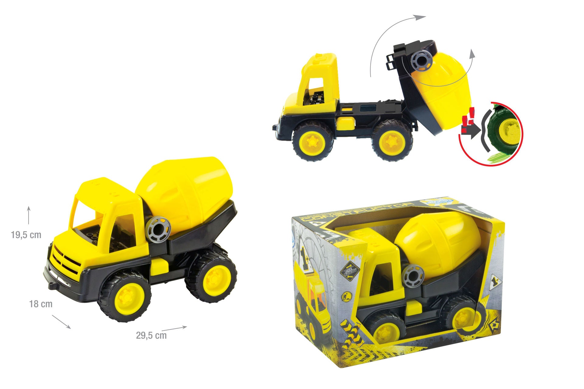 Cu un astfel de camion este usor sa te joci atat in nisip si in zapada cat si in casa. Cuva betonierei se poate bascula sau se poate roti.