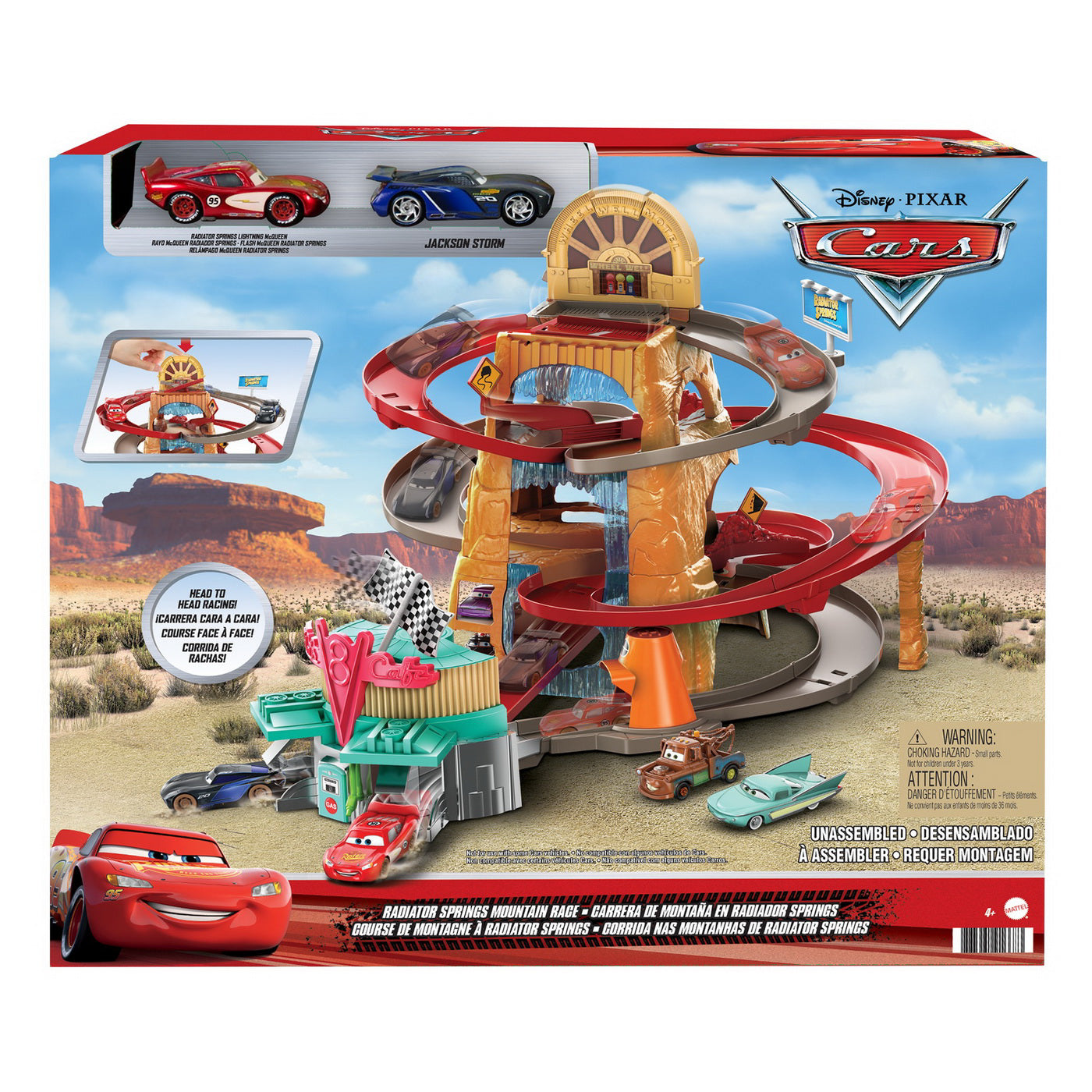 Acum fanii Masini de la Disney si Pixar pot reveni in locurile emblematice si terenul dur din apropiere de Valea Radiator! Este o cursa palpitanta intre doua masini de la Motelul Wheel Well, trecand in spirala printr-o cascada si prin pesteri si cladiri, pana la linia de sosire Cafeneaua lui Flo! Apasa pe motel pentru a ridica platforma si a elibera concurentii! Uneori se vor urmari, alteori se vor intersecta pe pista cine stie cine va castiga? Derivatoarele de pista fac ca fiecare cursa sa fie diferita, iar steagul in carouri indica invingatorul din fiecare runda. Include vehicule de curse Fulger McQueen si Jackson Vartej pentru distractie direct din cutie. Distractie palpitanta pentru fanii curselor care adora filmele Masini de la Disney si Pixar! Culorile si decoratiunile pot varia.&bull Acest set de joaca cu tematica Valea Radiator ofera fanilor Masini de la Disney si Pixar multa actiune cu curse intr-un loc indragit!&bull Concurati cu Fulger McQueen si Jackson Vartej (ambii inclusi) pe munte si prin cascada, pentru a fi primul care trece de Cozy Cone si termina la Cafeneaua lui Flo! &bull Cu o apasare pe Motelul Wheel Well, concurentii se lanseaza intr-o cursa pe munte. Derivatoarele de pista le schimba traseul, iar steagul in carouri indica invingatorul!&bull Setul complet de joaca include doua vehicule de curse, locuri de parcare si pompa de benzina. Joaca imediata, direct din cutie!
