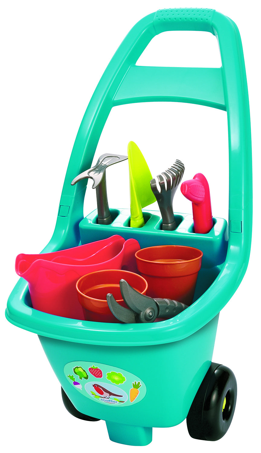 Caruciorul colorat este echipat cu 8 ustensile, grebla, lopata, stropitor, doua ghivece mici de flori.