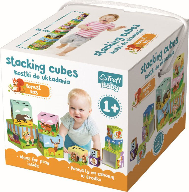 Cuburile pentru stivuit sunt un set de 10 cuburi de dimensiuni diferite care pot fi folosite pentru a construi un turn sau orice alta structura pe care o alegeti. Imagini frumoase si unice ajuta copiii sa invete numerele de la 1 la 10, sa cunoasca despre viata in ferma sau sa intalniti locuitorii padurii si descoperiti delicatesele lor preferate. Explorati locurile in care traiesc si urmariti-le pe caile ferate. Fiecare set include - 10 cuburi de stivuire colorate - brosura cu idei pentru joc