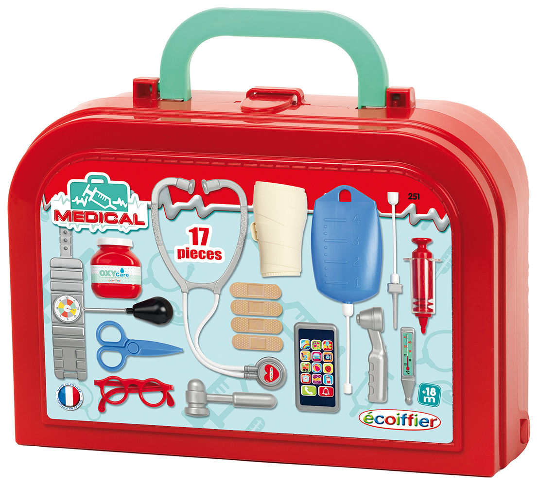 Setul contine: telescop, pahar, telefon, termometru, seringa, ciocanel, foarfeca, stetoscop, plasture.