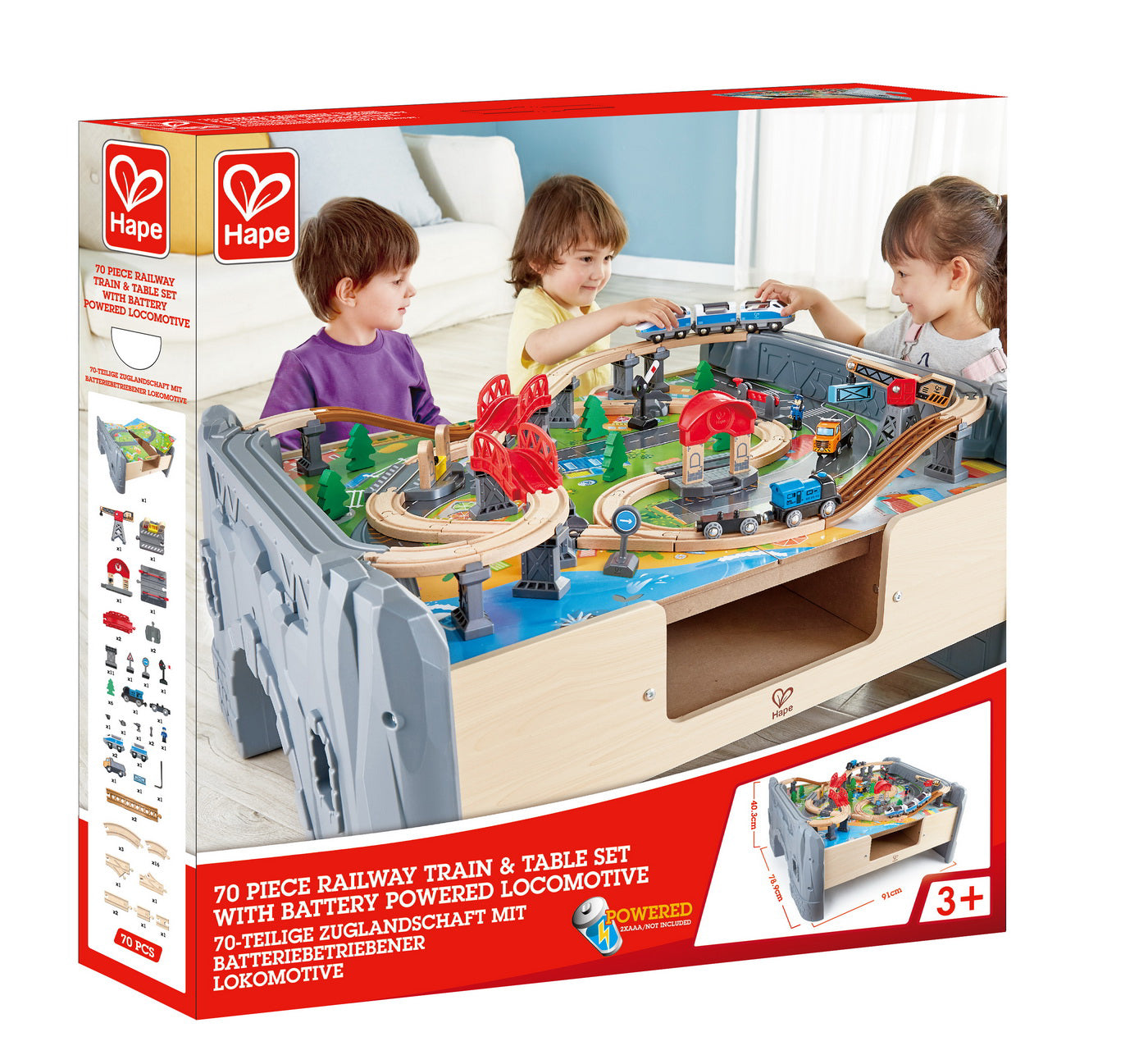 Creati un sistem de transport imens, cu mai multe straturi, cu acest minunat set de masa cu sine de tren cu 70 de piese. Include o locomotiva alimentata cu baterie si o multime de sine si accesorii.