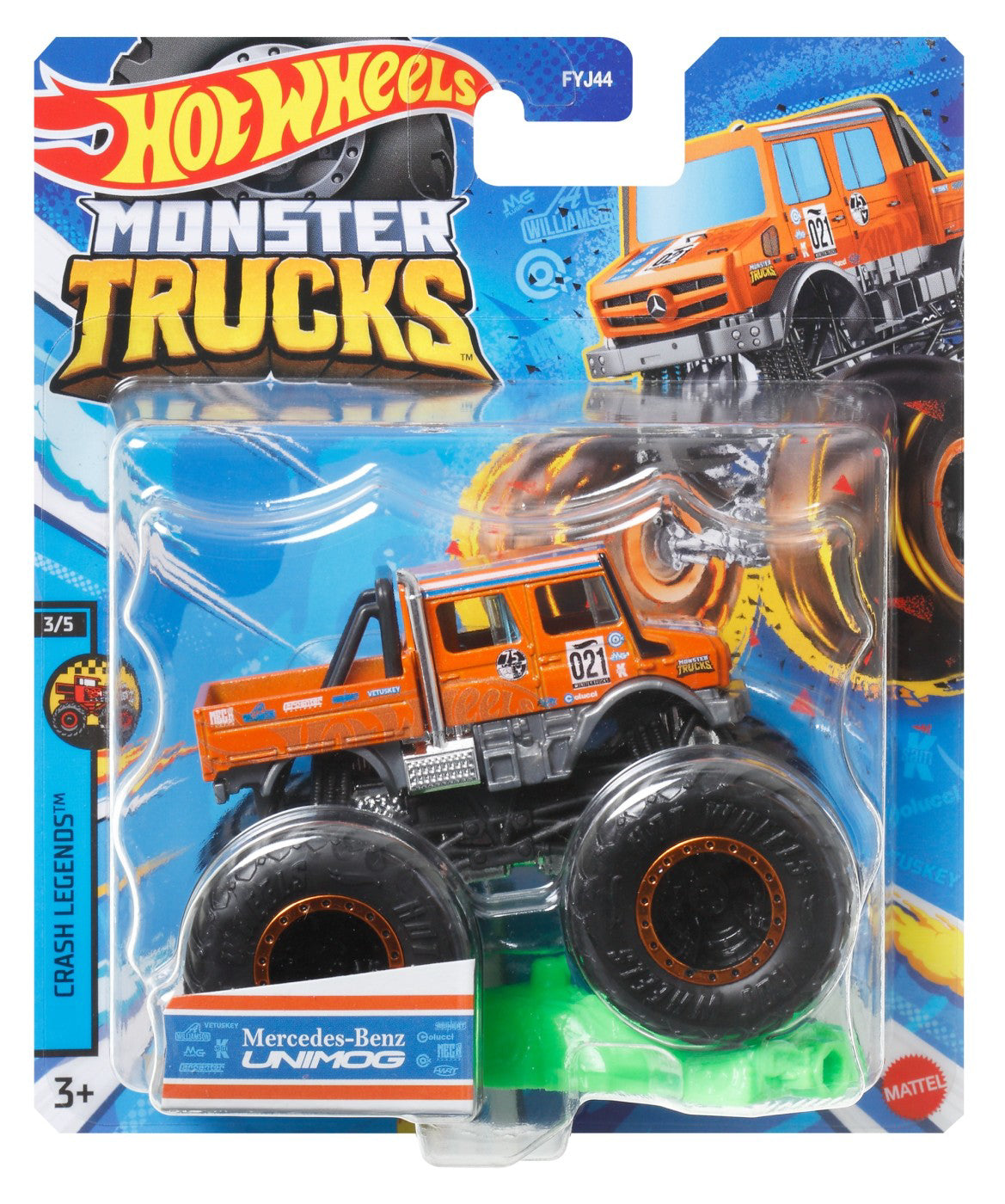 Colectioneaza masinutele Hot Wheeels gigantice pentru numeroase cascadorii. Striviti competitia cu masinuta de baza 164 are motoare puternice de frecare si actiuni feroce pe roti, acesti monstri sunt de neoprit. Fiecare se vinde separat, in functie de disponibilitate. Culorile si decoratiunile pot varia. Acest pachet contine personajul Mercedes Benz Unimog.