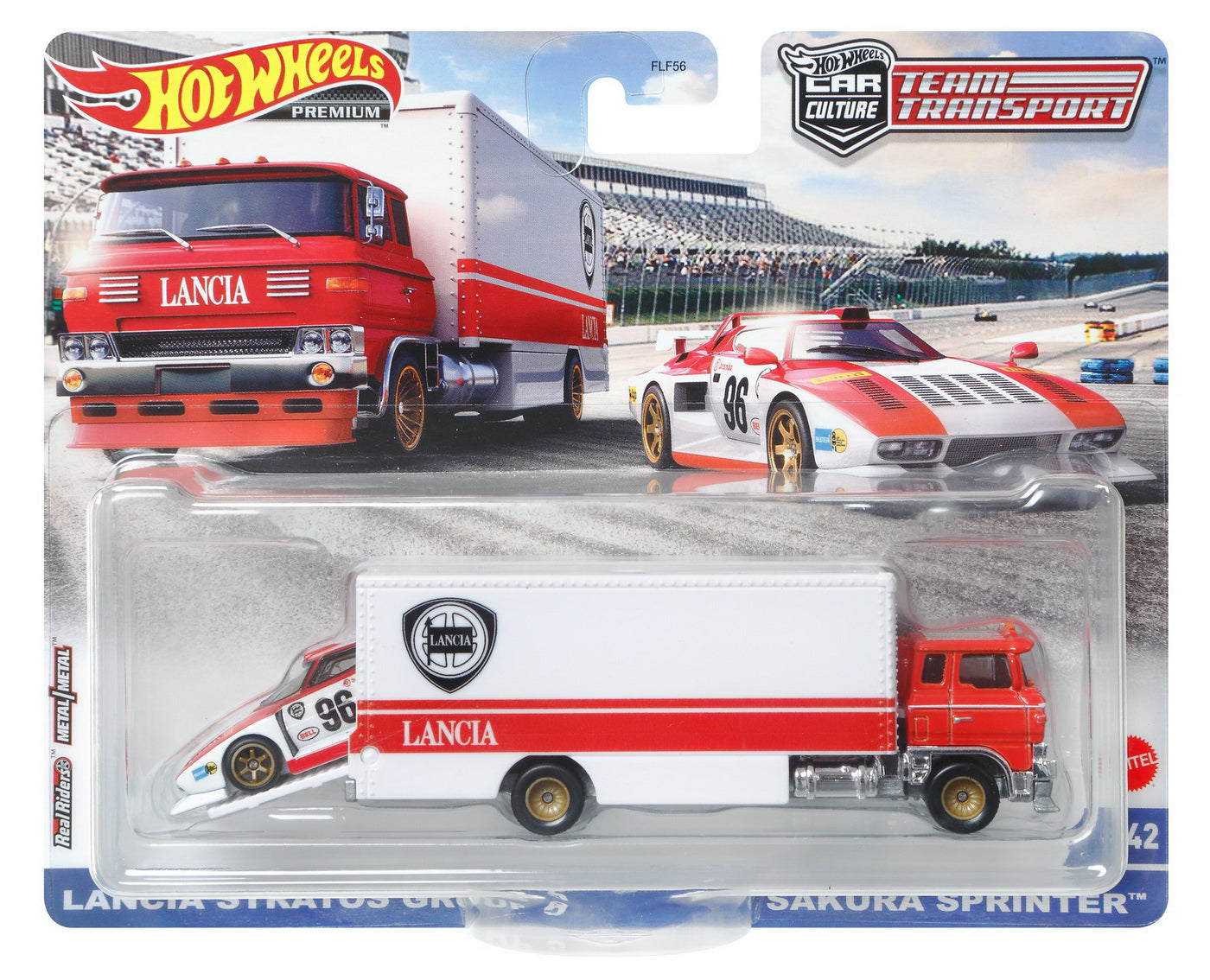 Sortimentul prezinta modele premium de transportatoare la scara 164 ce sunt cautate si indragite atat de copii, cat si de adulti colectionarii si pasionatii din intreaga lume. Realizate cu multa atentie la detalii si decoruri realiste foarte apreciate de cunoscatori. Sunt compatibile cu pistele si seturile de joaca Hot Wheels (achizitionate separat) si prind o viteza uluitoare pe pista! Transportatoarele vin impreuna cu o masina sport Hot Wheels. Fiecare se vinde separat, in functie de disponibilitate. Setul contine un transportor Lancia Stratos si o masinuta Sakura Sprinter.
