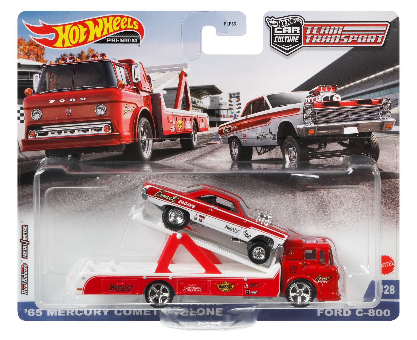 Sortimentul prezinta modele premium de transportatoare la scara 164 ce sunt cautate si indragite atat de copii, cat si de adulti colectionarii si pasionatii din intreaga lume. Realizate cu multa atentie la detalii si decoruri realiste foarte apreciate de cunoscatori. Sunt compatibile cu pistele si seturile de joaca Hot Wheels (achizitionate separat) si prind o viteza uluitoare pe pista! Transportatoarele vin impreuna cu o masina sport Hot Wheels. Setul contine un transportor Mercury Comet Cyclone 65' si o masinuta Ford C-800.