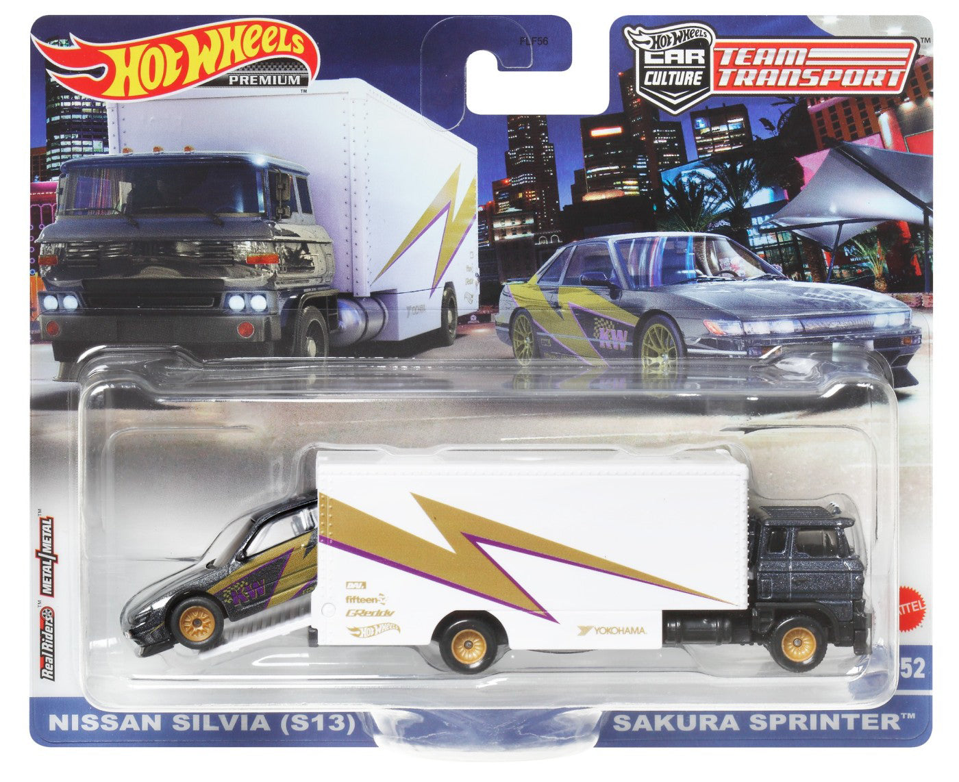 Sortimentul prezinta modele premium de transportatoare la scara 164 ce sunt cautate si indragite atat de copii, cat si de adulti colectionarii si pasionatii din intreaga lume. Realizate cu multa atentie la detalii si decoruri realiste foarte apreciate de cunoscatori. Sunt compatibile cu pistele si seturile de joaca Hot Wheels (achizitionate separat) si prind o viteza uluitoare pe pista! Transportatoarele vin impreuna cu o masina sport Hot Wheels. Fiecare se vinde separat, in functie de disponibilitate. Setul contine un transportor Sakura Sprinter si o masinuta Nissan Silvia.