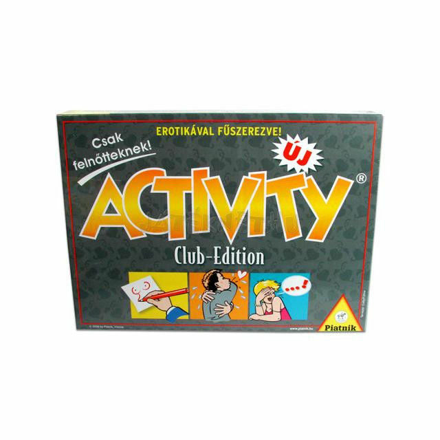 Activity Club este destinat exclusiv ADULTILOR, cuprinzand termeni mai piperati. Recomandam jocul persoanelor lipsite de inhibitii. Activity este un joc creativ, o combinatie de elemente: mima, descriere verbala sau desen.Toate aceste elemente trebuie folosite pentru a ajuta partenerii de joc sa ghiceasca anumite cuvinte, expresii. Acest joc este foarte distractiv, toata lumea va rade cu lacrimi. Jucatorii isi pot pune in evidenta personalitatea, capacitatile artistice, fantezia si indemanarea.Jucatorii individuali sau echipele incearca prin mima, desen sau descriere verbala sa ghiceasca diferite cuvinte sau expresii si astfel sa inainteze.Veti avea nevoie de creion si hartie.Recomandat pentru2-4 jucatori, peste 18 ani.Jocul este in limba MAGHIARA.Jocul contine: 770 cuvinte, o tabla de joc, cronometru, 4 figurine de lemn de diferite culori un regulament de joc
