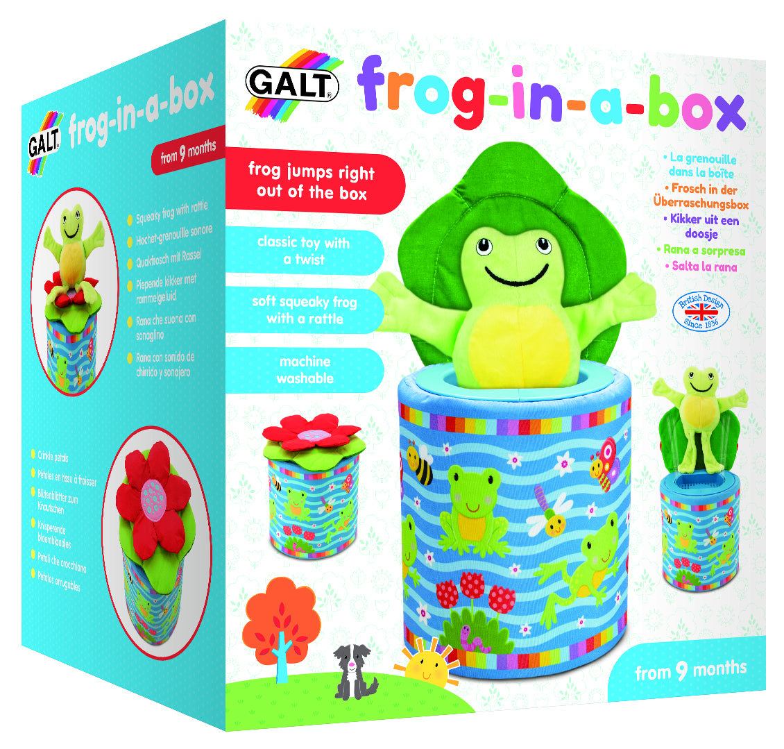Broscuta in cutie este versiunea distractiva si soft a clasicului "Jack in a box". La ridicarea capacului broasca va sari direct din cutie. Broasca scartaie si zornaie iar capacul are petale si diferite texturi pentru a fi explorate de catre cei mici. Fiind confectionata dintr-un material moale este sigura pentru copii. Jucaria este prevazuta cu capac detasabil si poate fi spalata in masina de spalat. Recomandat copiilor cu varsta de peste 9 luni.