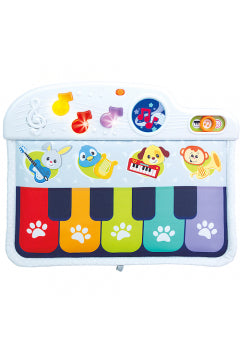 Pianul cu sunete distractive si lumini intermitente, tine copilasul ocupat lovind cu piciorul sau apasand tastele: note muzicale, melodii, 4 sunete de instrumente. Se ataseaza cu usurinta la patut.