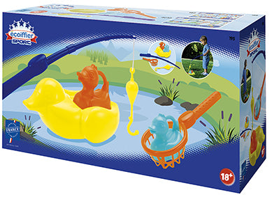 Setul contine o undita cu franghie si carlig, 2 rate mici care se plimba pe rata mama. Setul include si o plasa in care ratele pot fi prinse dupa vanatoare.