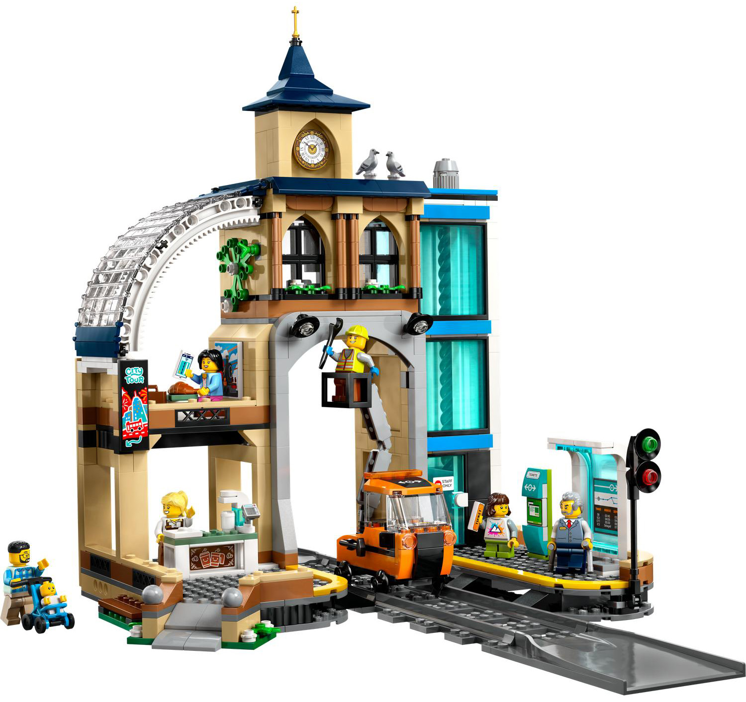 Bun-venit la Gara centrala! Verifica ecranul cu orarul de circulare, cumpara un bilet de la automat si relaxeaza-te in cafeneaua de sub acoperisul transparent. Urca in vagonul de mentenanta si ridica macaraua pentru a efectua reparatii sau ia liftul spre centrul de comanda. Hraneste porumbeii din turnul cu ceas sau asaza-te in statia de autobuz. Incep calatoriile memorabile in LEGO® City!
