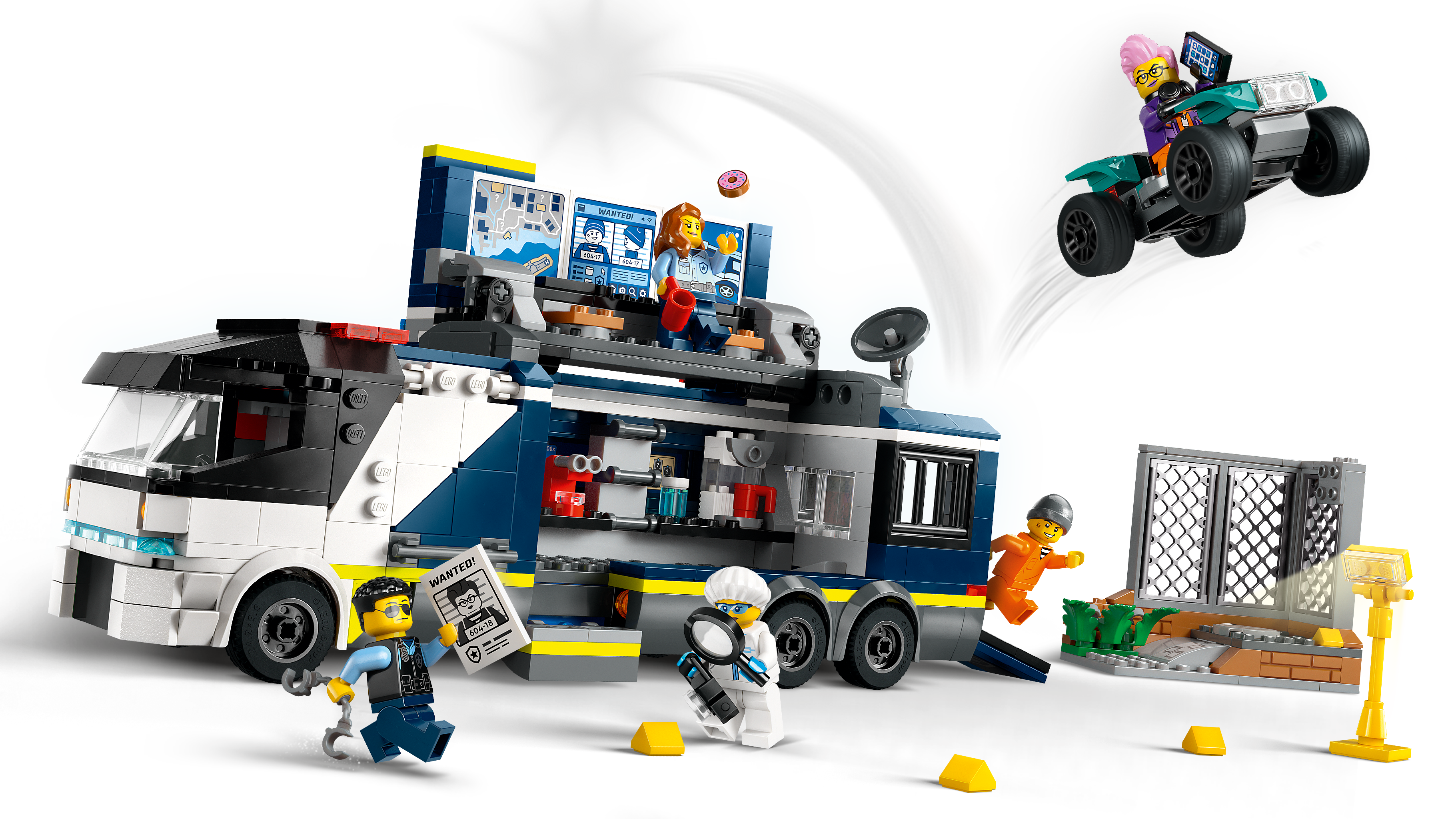 Un prizonier fugar si complicele sau sunt cautati de politie dupa o mare evadare de pe insula-inchisoare. Alatura-te echipei de ancheta la bordul laboratorului mobil de criminalistica. Acest camion este plin cu echipamente de investigatii pentru a da de urma pungasilor, inclusiv monitoare CCTV, un microscop si o lupa de nadejde! Ar putea un sir de indicii sa te conduca spre fugari? Te asteapta aventuri pe cinste cu echipa de criminalistica LEGO® City!