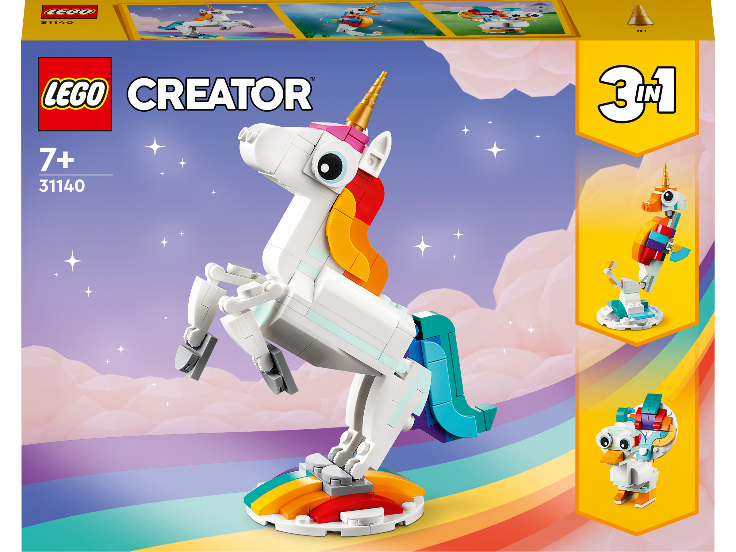 Copiii plini de imaginatie de 7+ ani vor fi transportati intr-un taram mitic, unde vor trai experiente fascinante, cu acest set de constructie 3 in 1 Unicorn magic (31140). Setul include un unicorn cu un corn auriu, o coada colorata, picioare si copite articulate. Unicornul poate fi asezat in 2 pozitii: stand pe cele 4 picioare sau ridicat pe cele 2 picioare din spate pentru o postura impresionanta si etalat pe stativul cu curcubeu din set.