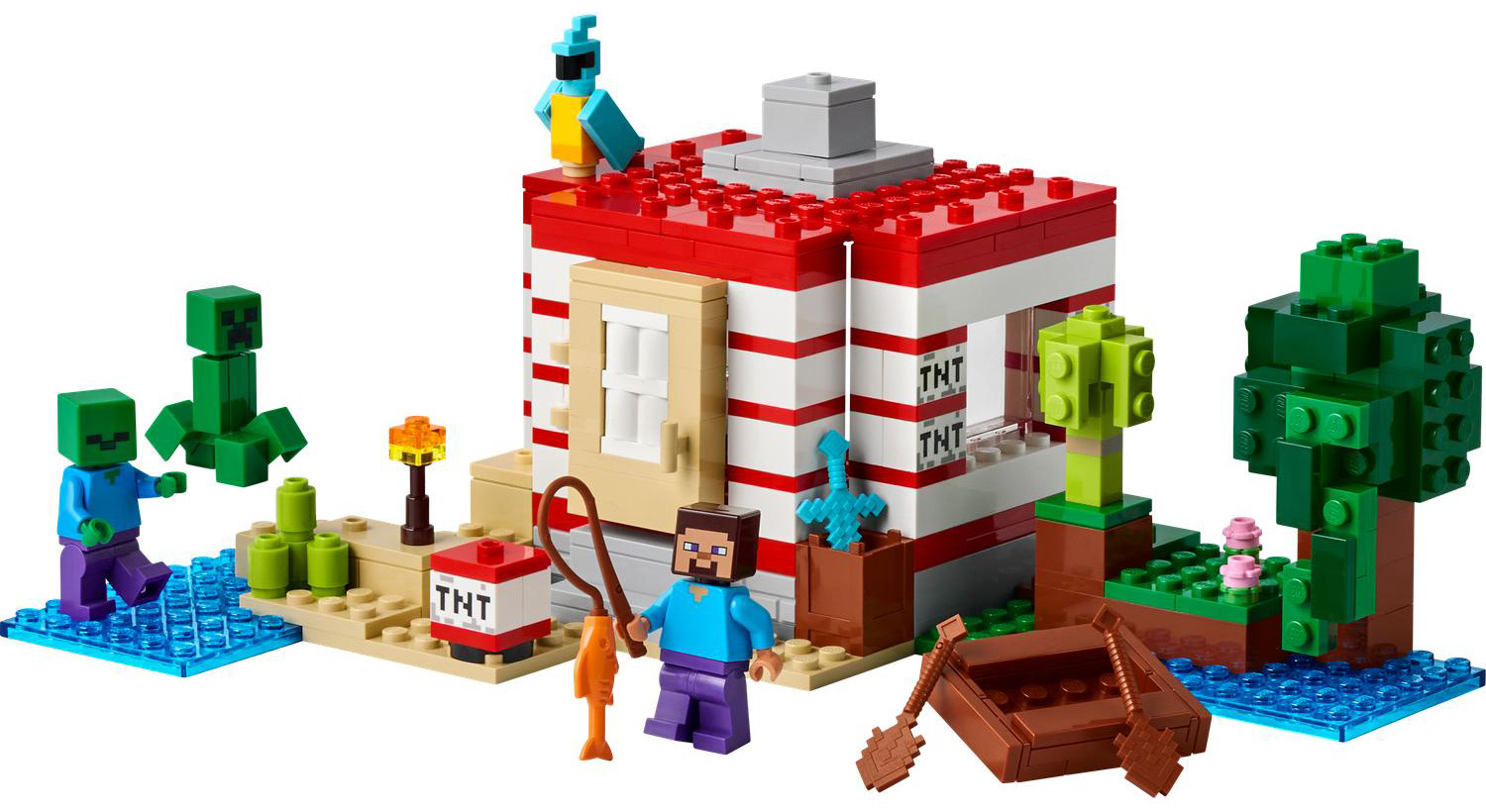 Casa construibila este amplasata in biomul jungla Minecraft si arata ca o versiune la scara larga a emblematicului element TNT din joc. Un buton lateral permite copiilor sa declanseze o functie de explozie TNT, care provoaca prabusirea intregii case. Ulterior, copiii pot reconstrui casa, ca sa fie gata pentru urmatoarea lor aventura. Minifigurinele Steve, Creeper™ si zombi inspira joaca fantezista si scenele de lupta. Accesoriile LEGO Minecraft autentice includ o barca, o undita, un peste, un papagal si frunzis de jungla. Aplicatia LEGO® Builder le ofera copiilor distractia suplimentara de a-si folosi dispozitivul pentru a apropia si roti modelele in 3D. Setul contine 287 de piese.
