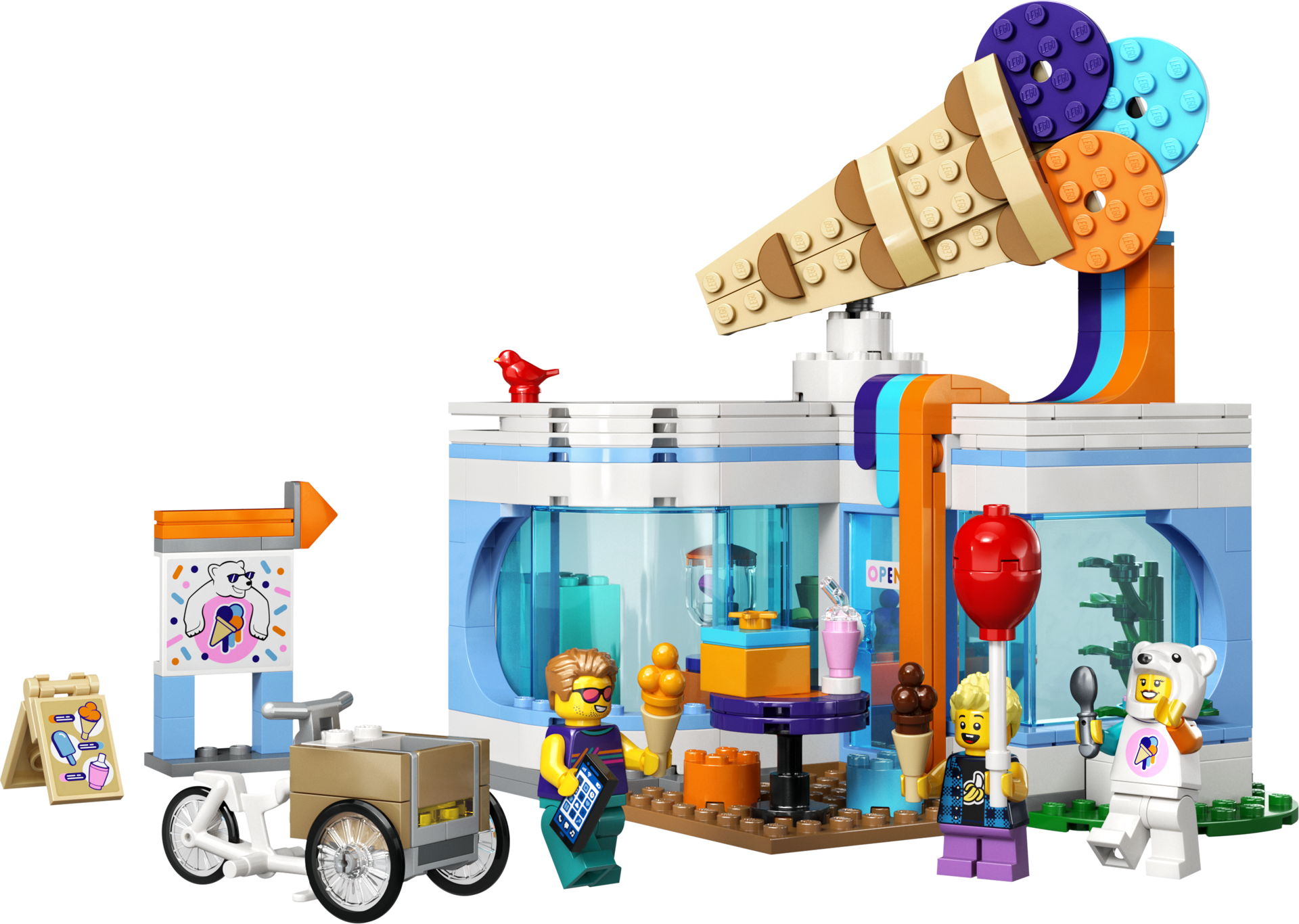 Urca pe bicicleta de marfa si porneste spre LEGO® City Magazin de inghetata. Ajuta angajatul sa serveasca si sa incante clientii cu delicioase inghetate si milkshake-uri. Acest local este chiar cool! Este destinatia perfecta pentru o petrecere de zi de nastere, avand o vitrina eleganta cu inghetata, un blender, un frigider si scaune la exterior unde prietenii si familiile se pot relaxa in vreme ce verifica optiunile din meniu.