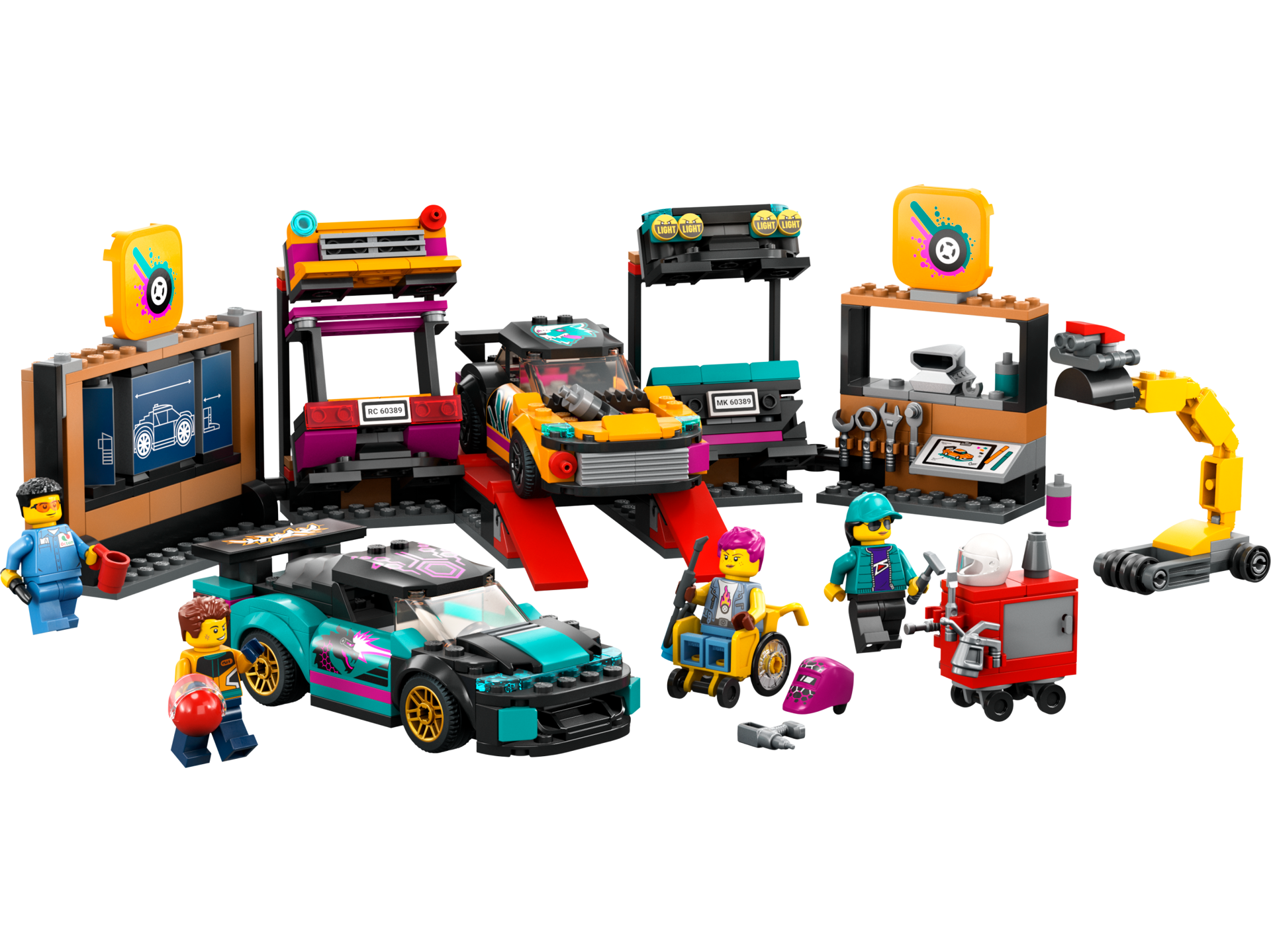 Bun venit la LEGO® City Service pentru personalizarea masinilor. Foloseste peretele inteligent de configurare pentru a crea modele spectaculoase. Ajuta mecanicii sa monteze faruri cool, spoilere pe spate si bare de protectie pentru raliuri si curse de drift. Condu vehiculele pe rampe pentru a fi modificate, vopsite si sudate. Foloseste troliul pentru a instala diferite motoare si viziteaza statia de tuning inainte sa pornesti la drum. Atelierul acesta este grozav!