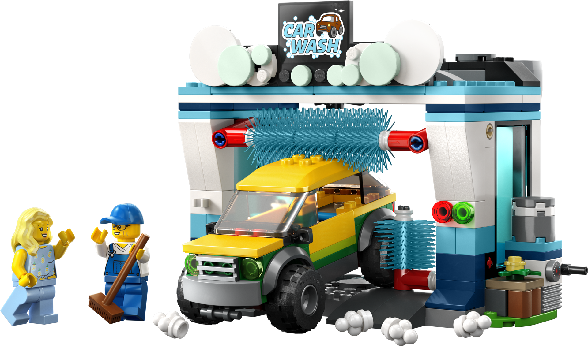 Mergi la LEGO® City Spalatorie de masini. Condu in interior ca sa activezi periile rotative de spalare. Alimenteaza dozatorul ca sa stropeasca masina cu spuma de sapun. Apoi pozitioneaza ventilatoarele pentru a usca vehiculul inainte de a conduce spre pompa ca sa-ti reglezi presiunea cauciucurilor. Spalarea masinii n-a fost niciodata mai placuta!