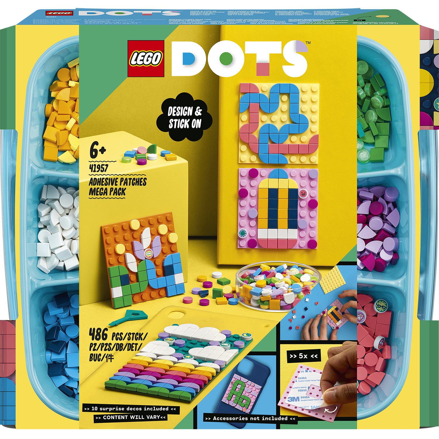 Copilul tau de sase ani sau mai mare vrea sa decoreze orice si adora activitatile de lucru manual? isi poate pune in practica ambele pasiuni cu acest kit distractiv LEGO® DOTS Mega pachet cu petice adezive (41957)! Acest set creativ contine cinci petice adezive de 8x8 in culori vii, care se lipesc pe orice suprafata tare si neteda, peste 450 de placute colorate, inclusiv zece placute decorate si o solutie de dezlipit placutele. Copiii pot crea usor si intuitiv un model mare sau mai multe modele mici care sa se potriveasca pasiunii lor si sa le etaleze stilul, apoi pot reface designul peticelor oricand doresc.