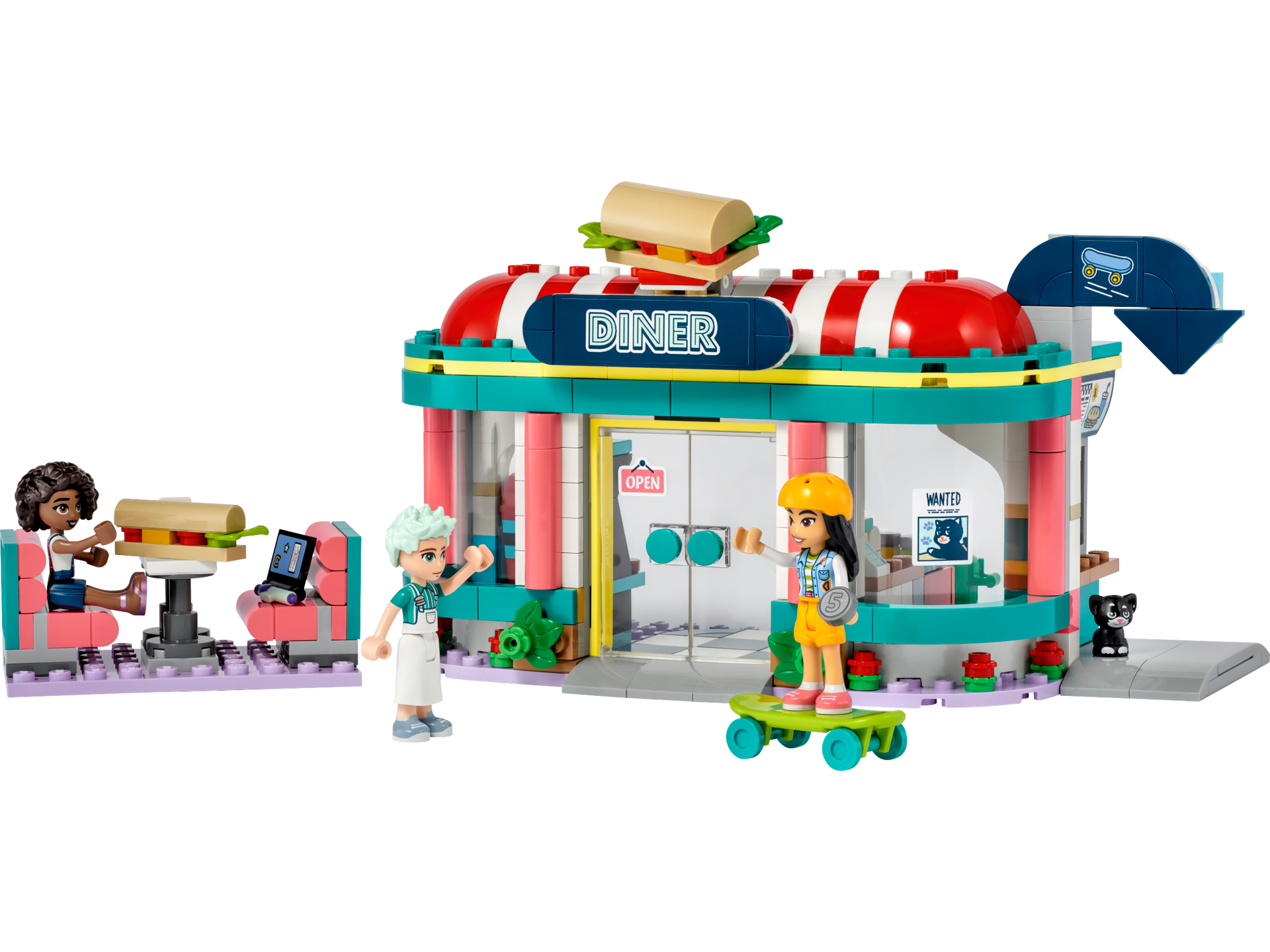 Copiii de 6 ani si mai mari isi pot inchipui multe povesti cu setul de constructie LEGO® Friends Restaurant in centrul orasului Heartlake (41728). Avand multe accesorii care sa inspire joaca creativa, ei isi pot imagina ca prepara sendvisuri sau ca sunt clienti ai restaurantului. Dotarile includ o fereastra de servire, scaune la exterior, precum si un joc electronic si un tonomat functional. Copiii pot folosi ingredientele pentru salata din frigider pentru a crea diferite tipuri de sendvisuri. Alte accesorii includ 2 bauturi, bani, 3 felii de paine pentru sendvisuri, un suport pentru servetele, un cos de gunoi si o placa de skateboard. Mai exista si o pisica sireata care adora sa viziteze restaurantul!