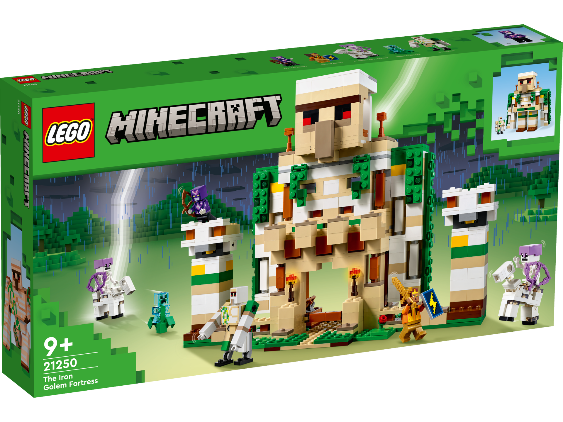 Acest set impresionant ofera copiilor 2 scenarii de joaca. Primul e o fortareata golem, in care se afla 2 eroi din joc, Cavalerul Cristal si Cavalerul Aauriu, care isi protejeaza baza de atacatori, un Creeper™ incarcat si 2 calareti schelet. Pentru a conferi mai multa intensitate actiunii, copiii pot reconfigura fortareata intr-o figurina golem impunatoare, cu brate mobile imense. Datorita numeroaselor dotari si accesorii Minecraft, posibilitatile de joaca sunt nelimitate. Pentru mai multa distractie digitala, constructorii pot apropia, roti seturile in 3D si-si pot monitoriza progresul folosind aplicatia distractiva si intuitiva LEGO Builder.