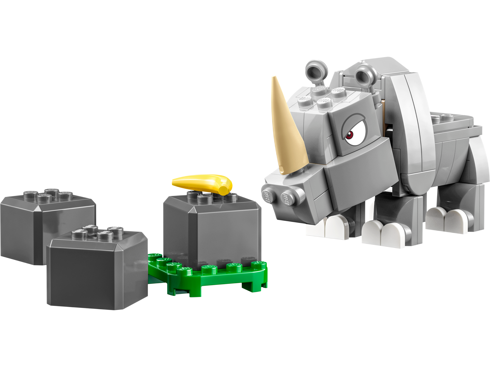 Pregateste-te pentru distractie senzationala in universul LEGO® Super Mario™! Sari pe spatele rinocerului Rambi cu LEGO® Mario™, LEGO® Luigi™ sau LEGO® Peach™ (figurinele interactive nu sunt incluse) si intra in actiune. Intra in gramada de pietre ca sa le rastorni si sa descoperi o banana!