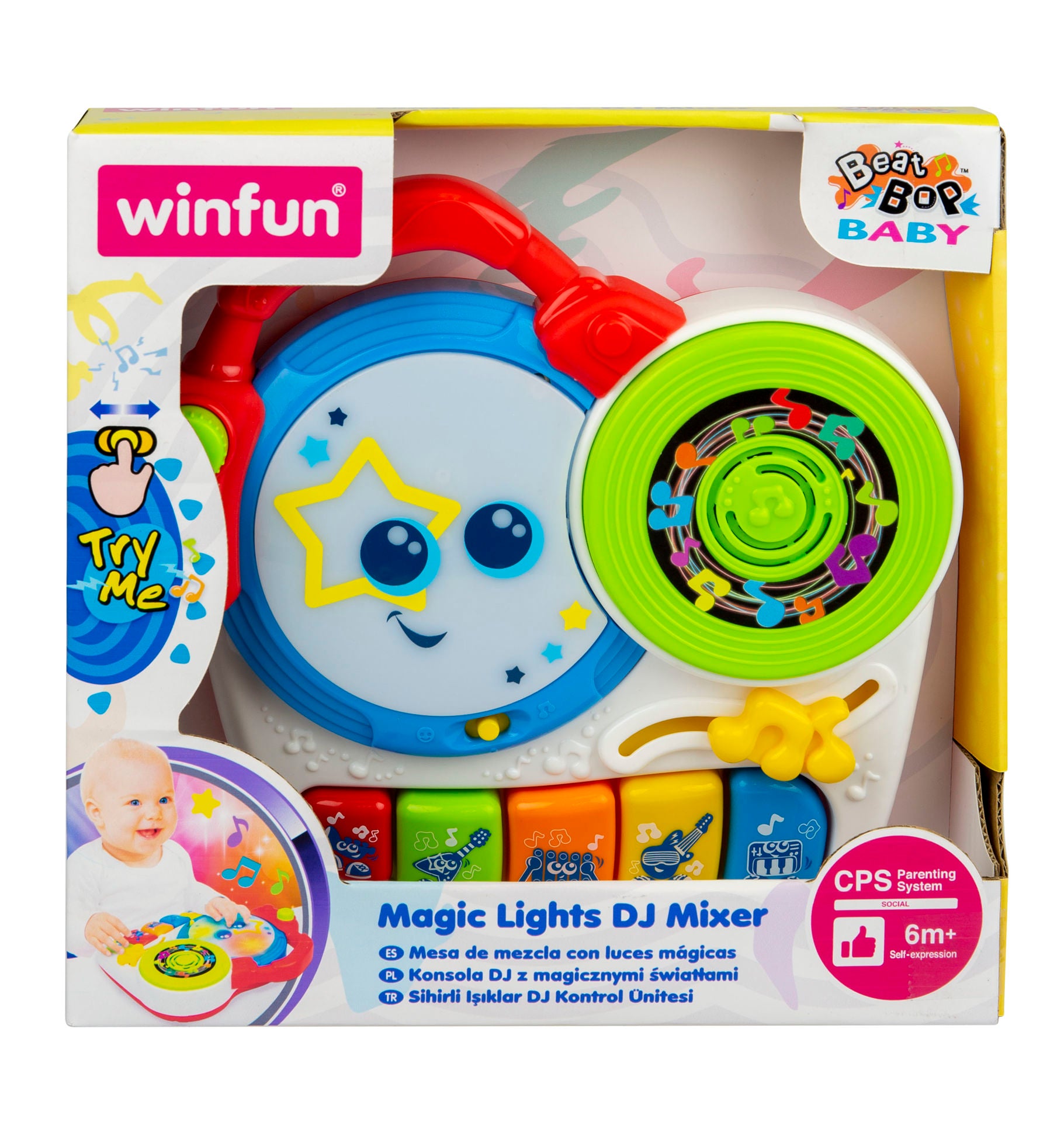 DJ mixer interactiv cu tonuri si sunete vesele. Moduri de joaca: muzica instrumentala solo si joaca cu melodii. 5 butoane cu instrumente muzicale, partea cu tambur cu lumini magice intermitente. Pentru activitatile tactile