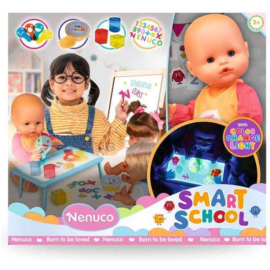 Nenuco Smart School este prima papusa Nenuco cu masa luminoasa multicolora si accesorii translucide. Include toate accesoriile necesare pentru a organiza o scoala senzoriala acasa si pentru a te juca de-a profesorul. Nenuco este un bebelus de 35 cm, cu corp tare, care poarta un sortisor de scoala. Nota: Aceasta descriere a fost tradusa automat in limba romana.