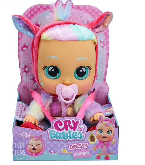 Cry Babies au un nou look de zi! Faceti cunostinta cu noul Cry Babies Dressy Fantasy din lumea fanteziei. Poarta tinute colorate noi, au parul adevarat pentru un plus de distractie, ochi draguti de cristal si un design usor, astfel incat sa le poti lua cu tine oriunde mergi. La fel ca toti Cry Babies, plang lacrimi adevarate si scot 10 sunete realiste de bebelus atunci cand ii scoti manechinul! Pune manechinul la loc sau intinde-le pentru a-i opri sa planga. Cry Babies sunt papusile interactive perfecte pentru un joc imaginativ distractiv.