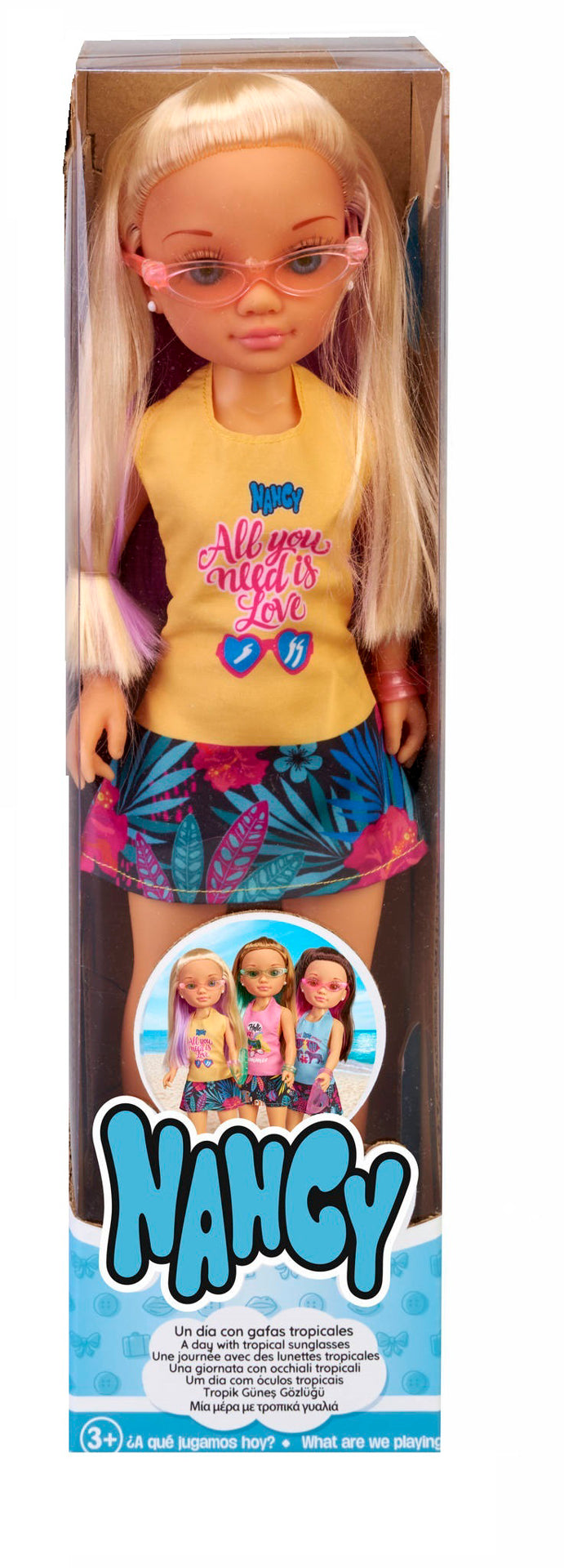 Papusa blonda, Nancy poarta o rochie frumoasa, la moda, cu imprimeu de frunze, o pereche frumoasa de ochelari si o pereche de slapi.