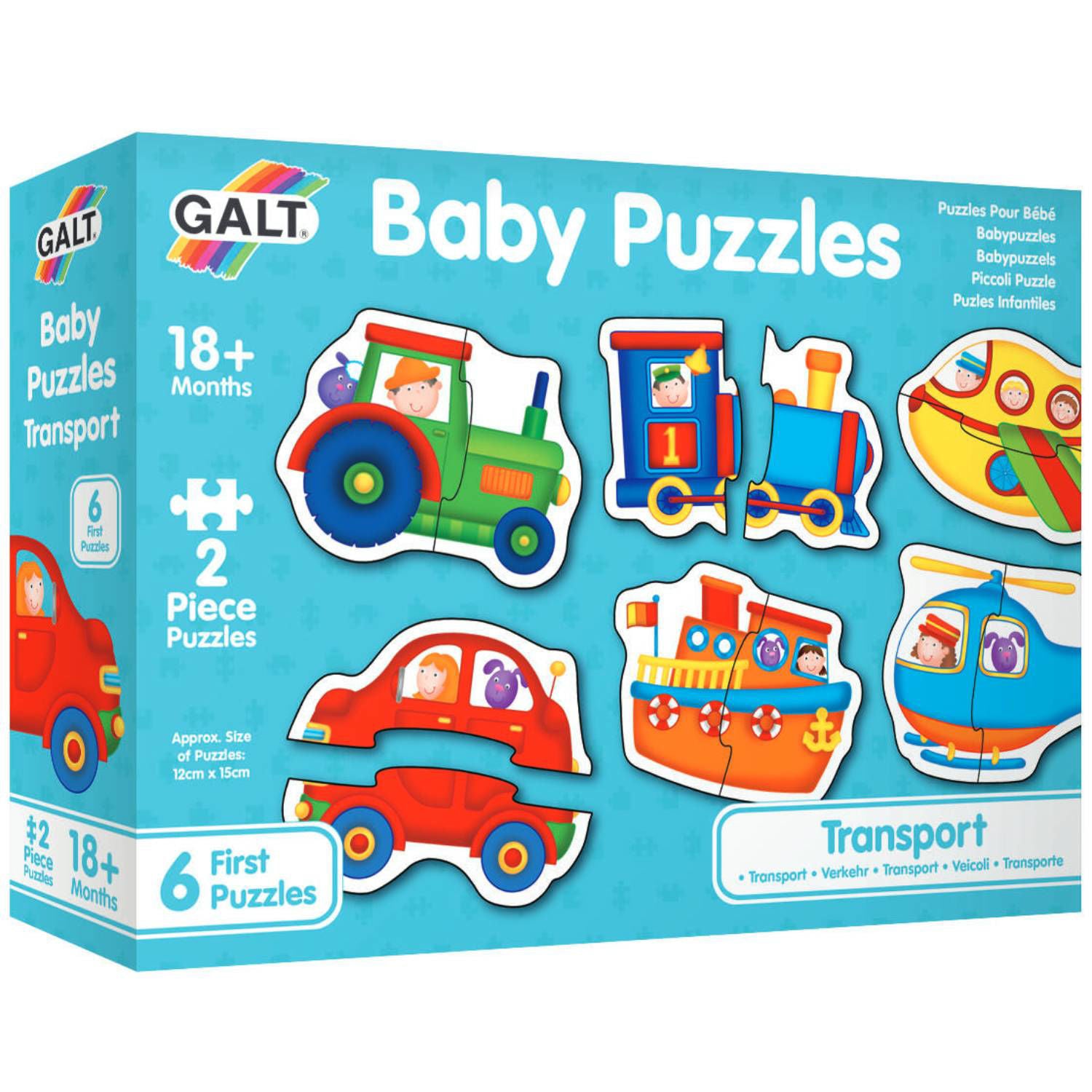 Set de 6 puzzle-uri a cate 2 piese fiecare pentru cei mici. Cele 6 puzzle-uri au piese mari si incurajeaza abilitatile de indemanare si asociere inca de la o varsta frageda. Vehicule ilustrate: avion, masina, elicopter, vapor, locomotiva si tractor.