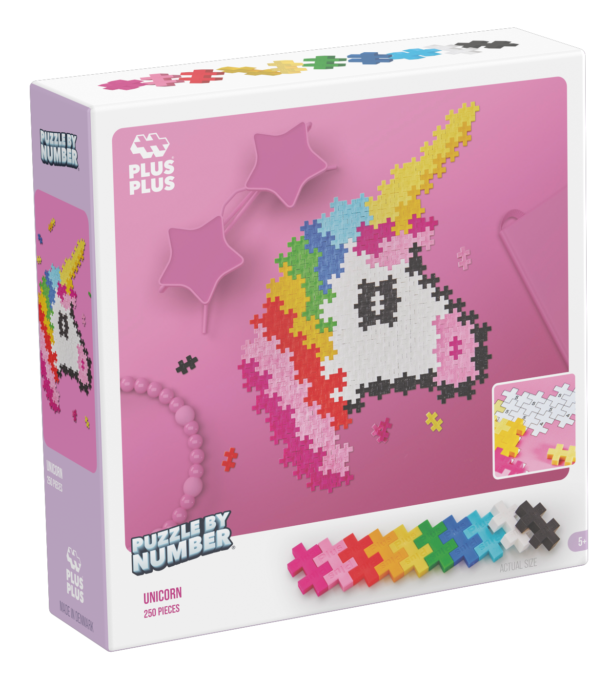 Puzzle by Numbers combina jocul distractiv cu Plus-Plus si invatarea. Potriviti culorile si numerele si creati-va mozaicul. Setul Unicorn vine cu 250 de bucati in care puteti crea un cap de Unicorn colorat. Decoreaza-ti camera sau creeaza ceva nou.