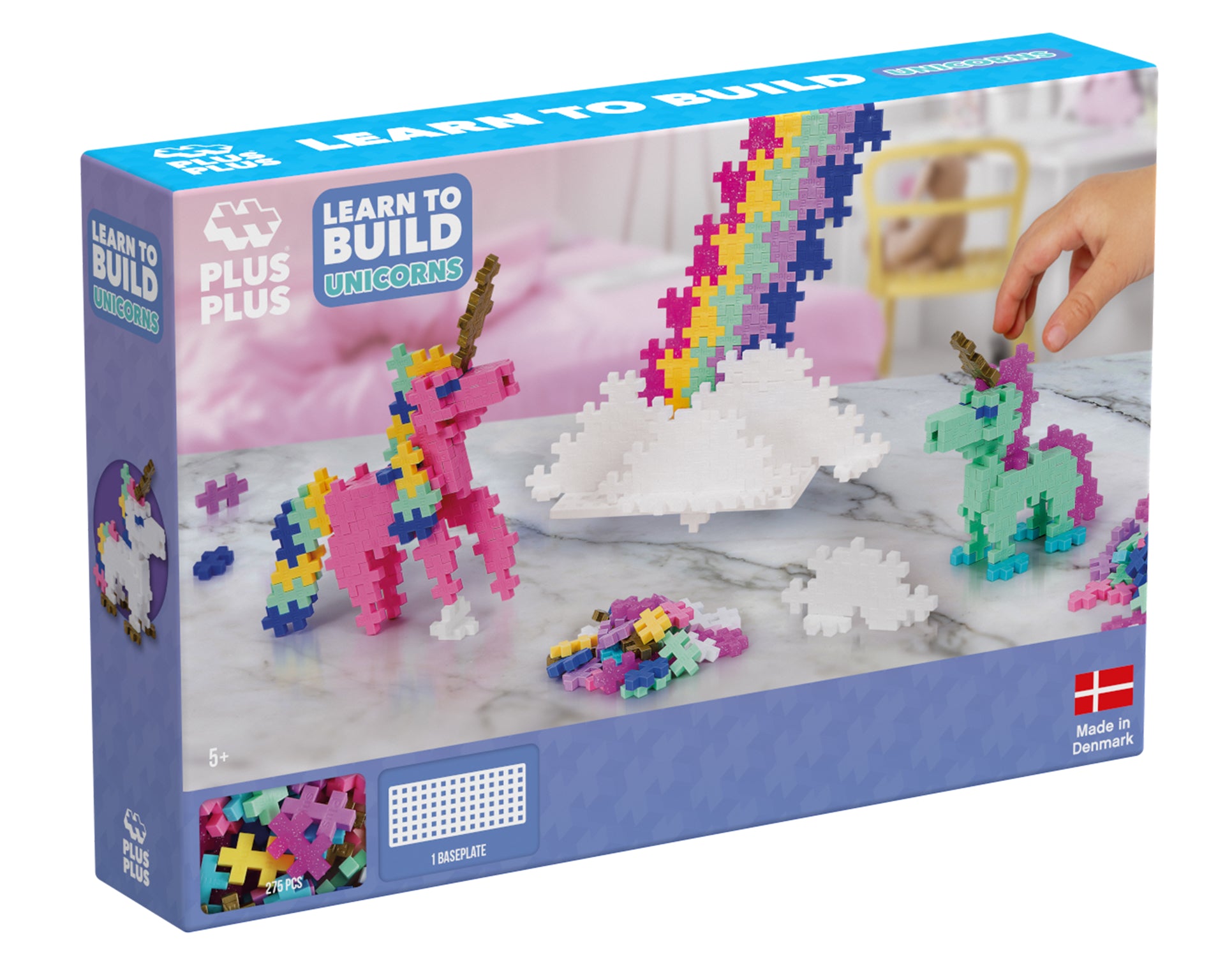 Invata sa construiesti Unicorni si nori cu Plus-Plus. Acest set vine cu 275 de piese si o placa de baza mica. Un ghid ofera instructiuni pas cu pas pentru a construi atat unicorni 3D, cat si 2D.