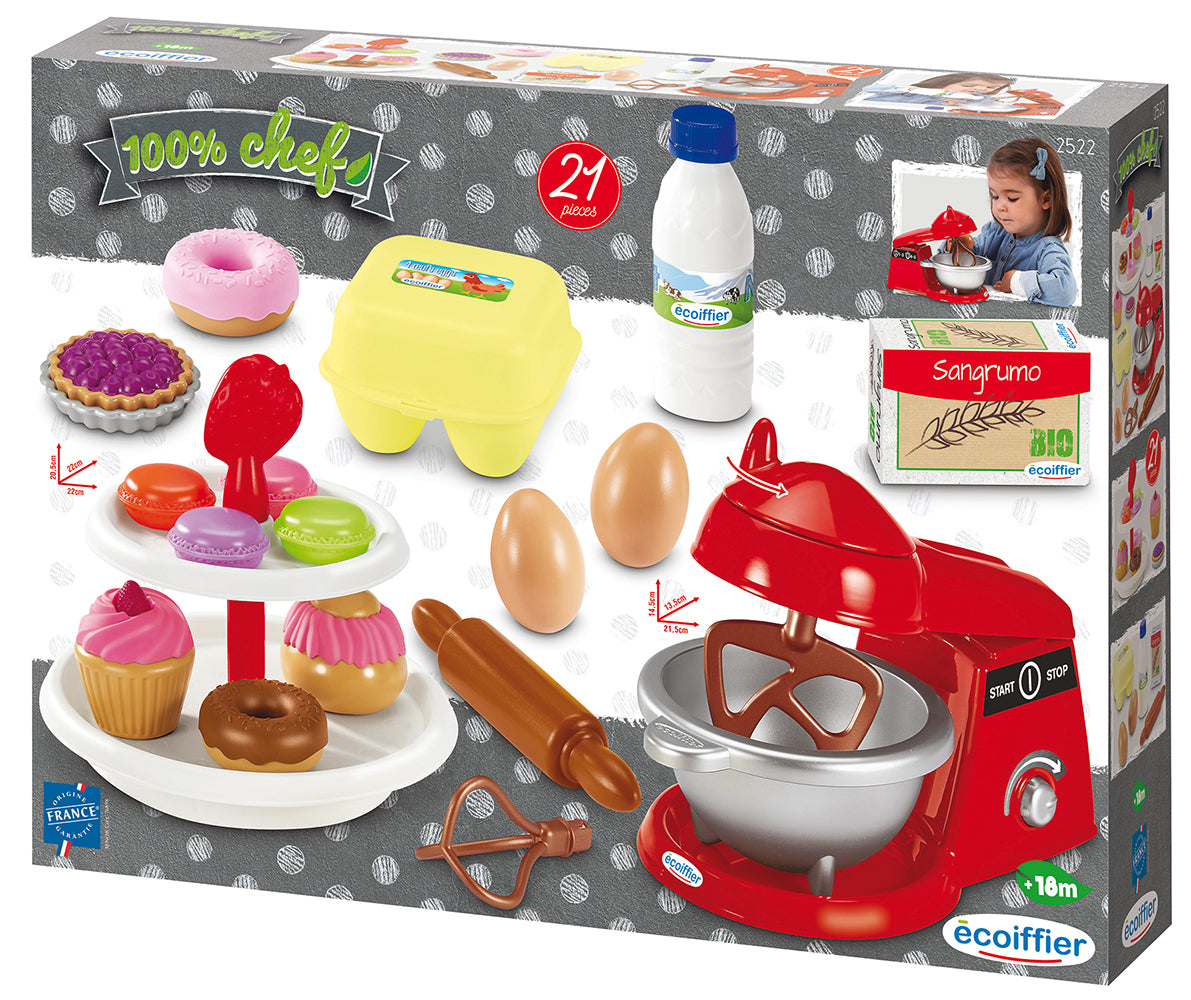 Setul de 21 de piese include un robot de bucatarie mecanic cu palete de mixare care se pot schimba, o sucitoare, 2 oua, o sticla de lapte, o caserola pentru oua cu imaginea unei gaini, o varietate de prajituri dulci si deserturi care pot fi plasate pe un stand de desert cu 2 etaje, cu partea de sus in forma de capsuna.