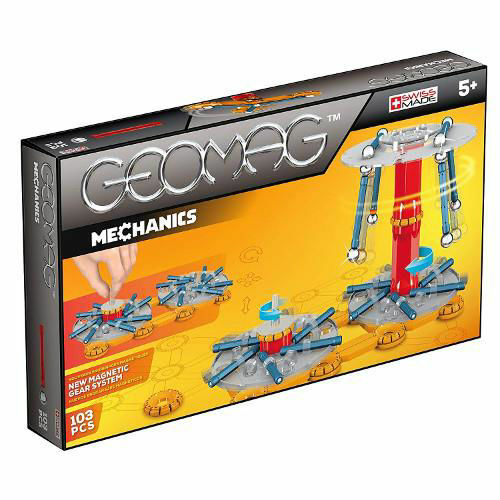 Setul de piese Geomag contine: 36 sfere metalice nemagnetice, 17 bare metalice magnetice albastre, 1 tija indicator, 2 tuburi, 2 tuburi de un sfert, 14 saibe, 12 picioare, 12 bare liniare, 2 patrate, 2 custi, 2 placi si 1 con.