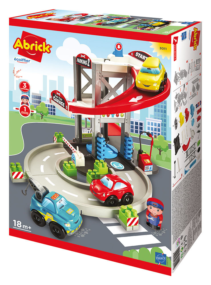 Garajul cu etaj si cele 3 masinute Abrick, este o jucarie moderna, care il fascineaza pe fiecare baietel pentru un timp indelungat. La parter se afla o spalatorie auto, ca masinutele sa straluceasca tot timpul, la etajul 1 este un garaj, iar la etajul 2 se afla parcarea.