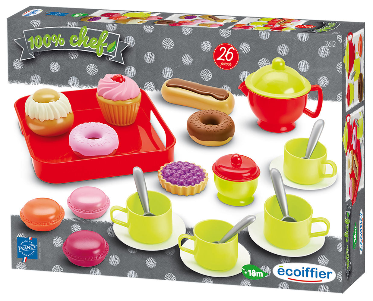 Setul ofera bucurie fiecarei copilas care doreste sa-si surprinda prietenii cu ceaiul de la ora cinci in camera lor sau in gradina. Acest set este ideal pentru fiecare bucatarie de jucarie si contine 26 de accesorii, printre care o tava, pahare, farfurii, lingurite, produse de patiserie si multe altele.