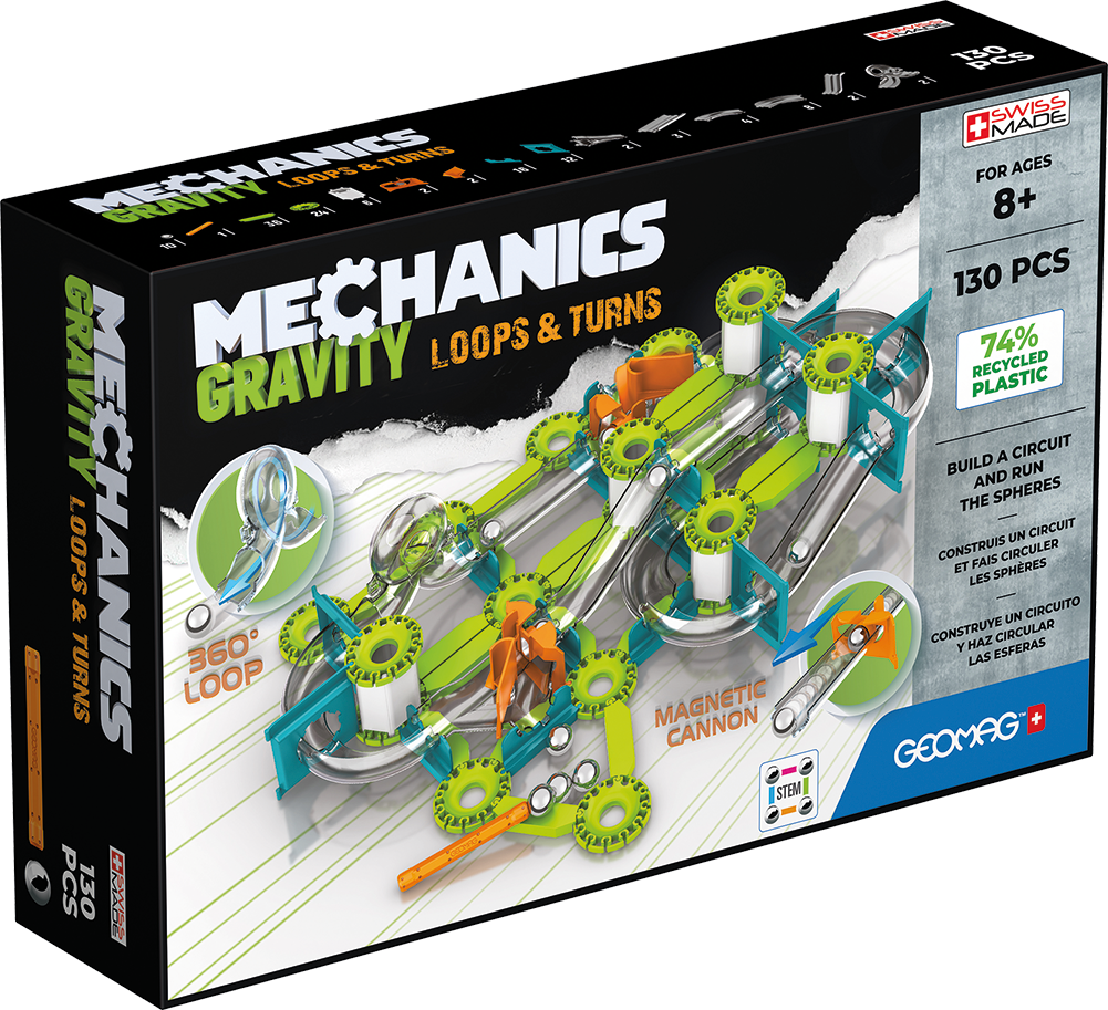 Realizata din plastic reciclat, Geomag Mechanics Gravity Loops & Turns combina forta magnetismului cu constructia mecanica.