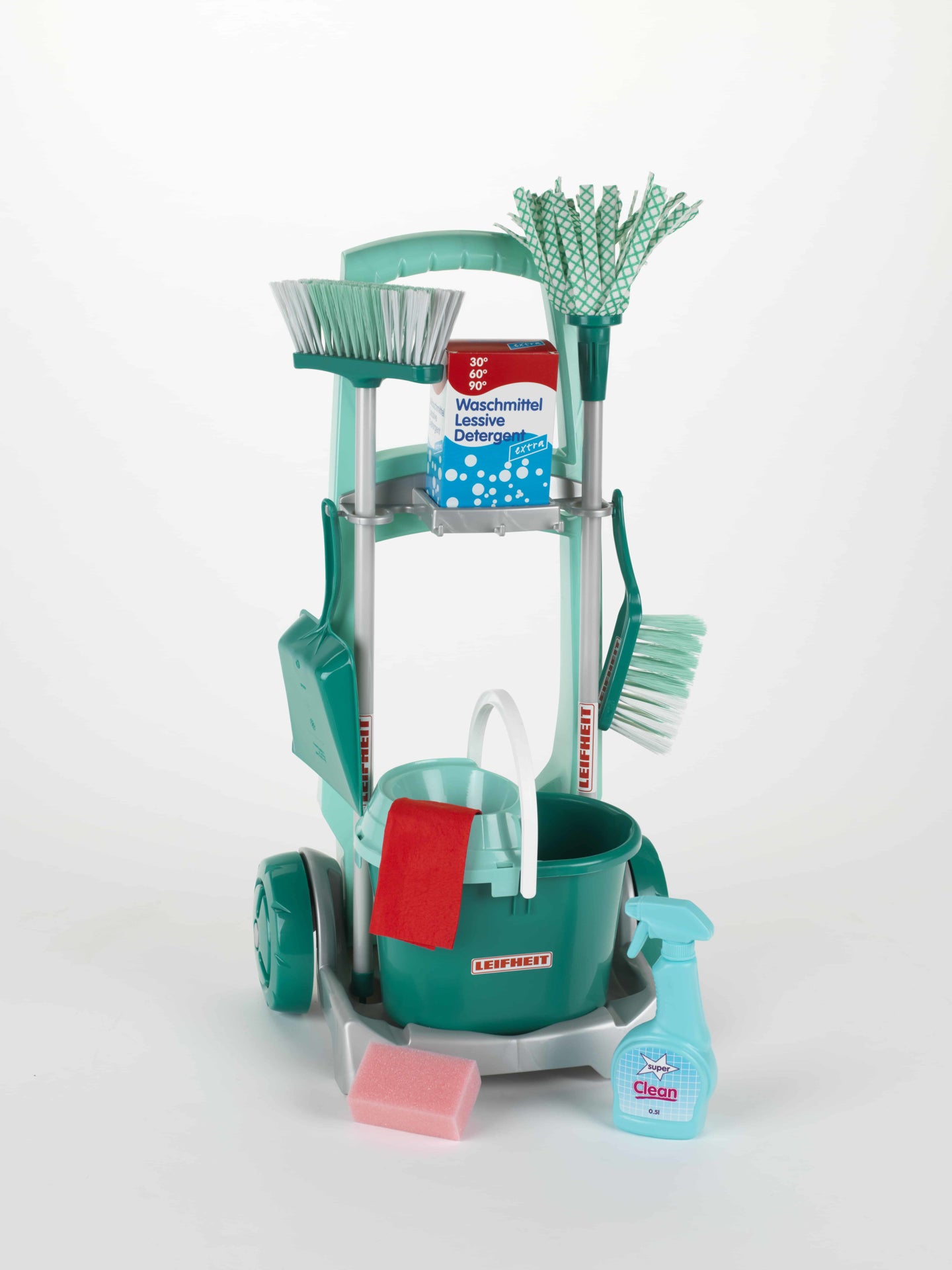 Setul include: galeata, mop, matura, faras, detergent, laveta si burete.