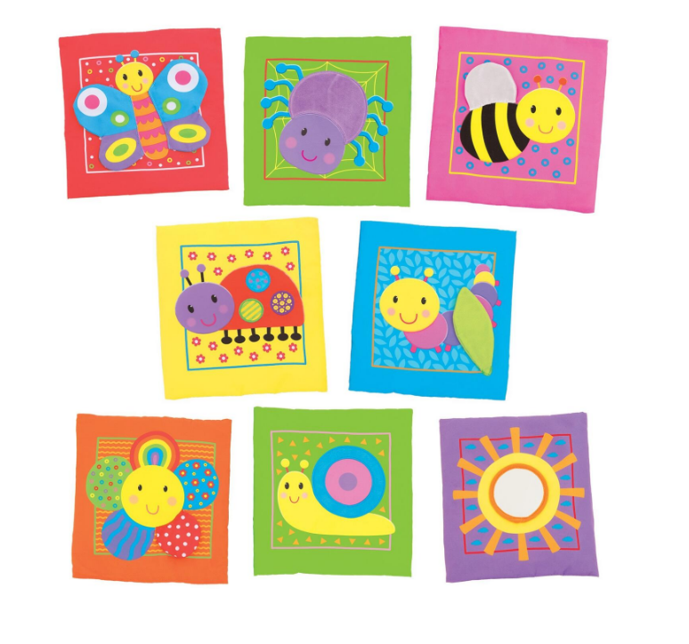O carte plina de culoare cu 8 pagini din material moale si texturi diferite. Cartea are aripioare fosanitoare; corp cu blanita, aripioare stralucitoare, zone din satin, oglinjoara in forma de soare si frunze care chitaie.Poate fi spalata la masina.