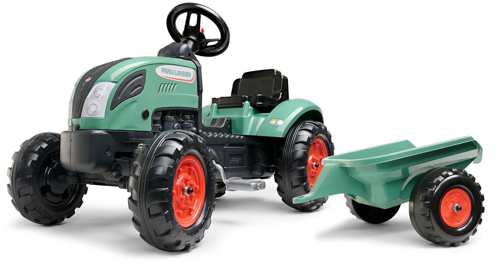 Tractor cu pedale si remorca special conceput pentru micii gradinari de la 2 la 5 ani care se vor bucura sa incarce si sa transporte nisip, frunze, pamant si pietricele de la un capat pana la celalalt din gradina.