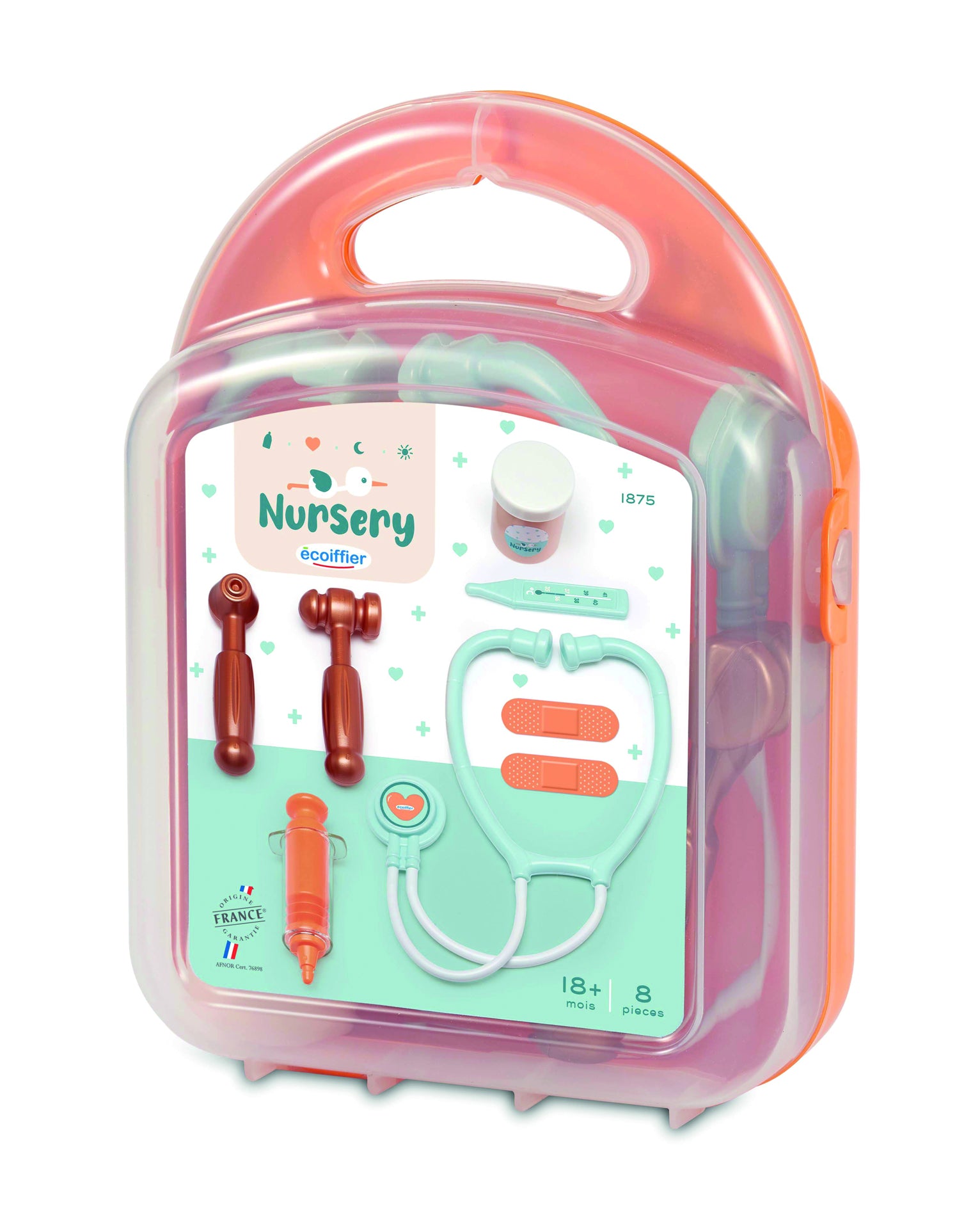 O trusa de medic pediatru care contine tot ce au nevoie cei mici pentru a-si trata papusa: stetoscop, plasture,, ciocan reflex, termometru si seringa.